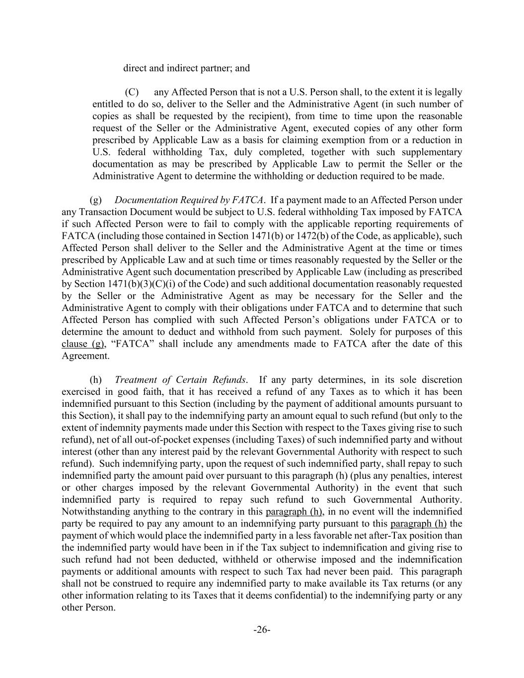 -26-直接和间接合伙人;(c)任何不是美国人的受影响人士,在其合法有权这样做的范围内,应卖方或行政代理人的合理请求,不时向卖方和行政代理人(按收件人要求的副本数量)交付适用法律规定的任何其他表格的已签立副本,作为申请豁免或减少美国联邦预扣税的依据,并已妥为填写,连同适用法律可能规定的补充文件,以允许卖方或行政代理人确定所需的扣缴或扣除。(g)FATCA要求的文件。如果根据任何交易文件向受影响人支付的款项将被征收FATCA征收的美国联邦预扣税,如果该受影响人未能遵守FATCA的适用报告要求(包括《守则》第1471(b)或1472(b)条所载的要求,视情况而定),该受影响者应在适用法律规定的一个或多个时间以及卖方或行政代理人合理要求的一个或多个时间向卖方和行政代理人交付适用法律规定的文件(包括《守则》第1471(b)(3)(c)(i)条规定的)以及卖方或行政代理人合理要求的额外文件,以使卖方和行政代理人遵守其在FATCA下的义务并确定该受影响人已遵守该受影响人在FATCA项下的义务或确定从此类付款中扣除和扣留的金额。仅就本(g)条款而言,“FATCA”应包括在本协议日期之后对FATCA作出的任何修订。(h)某些退款的处理。如任何一方当事人凭其善意行使的唯一酌情决定权,确定已收到其依据本条获得赔偿的任何税款的退款(包括依据本条支付额外款项),则须向赔偿一方支付与该退款相等的款额(但仅限于根据本条就引起该退款的税款支付的弥偿款项),扣除该受偿方的所有自付费用(包括税款),且不计利息(有关政府当局就该退款支付的任何利息除外)。该受偿方应该受偿方的请求,应向该受偿方偿还根据本款(h)支付的金额(加上相关政府当局施加的任何罚款、利息或其他费用),如果该受偿方被要求向该政府当局偿还该退款。尽管本款(h)项另有相反规定,但在任何情况下,均不会要求受赔方根据本款(h)项向受赔方支付任何款项,而如果未扣除、扣缴或以其他方式征收须予赔偿并导致此类退款的税款,且从未支付与此类税款有关的赔偿款项或额外款项,则支付该款项将使受赔方处于比受赔方更不利的税后净额状况。本款不得解释为要求任何受赔偿方向赔偿方或任何其他人提供其纳税申报表(或其认为保密的与其税款有关的任何其他信息)。