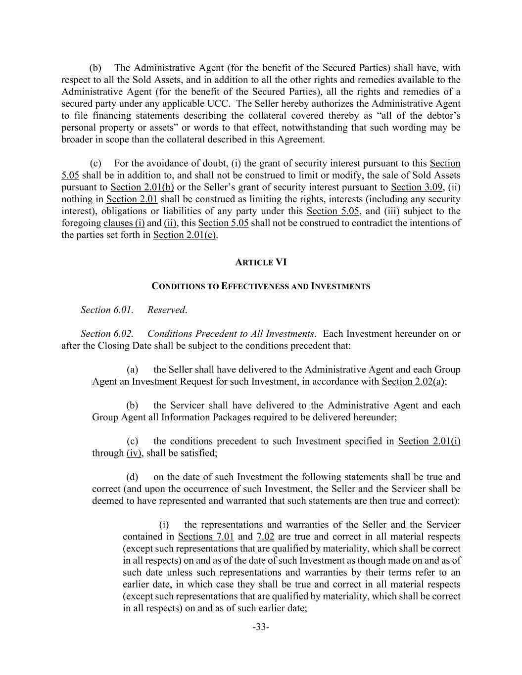 -33-(b)行政代理人(为担保方的利益)就所有出售的资产而言,除行政代理人(为担保方的利益)可利用的所有其他权利和补救措施外,还应拥有担保方在任何适用的UCC下的所有权利和补救措施。卖方特此授权行政代理人提交融资报表,将其涵盖的担保物描述为“债务人的所有个人财产或资产”或大意如此的词语,尽管此类措辞的范围可能比本协议中描述的担保物更广。(c)为免生疑问,(i)依据本条第5.05条授予的担保权益,须是依据第2.01(b)条出售已售资产或卖方依据第3.09条授予的担保权益的补充,且不得解释为限制或修改,(ii)第2.01条的任何规定均不得解释为限制任何一方根据本条第5.05条享有的权利、权益(包括任何担保权益)、义务或责任,及(iii)受上述第(i)及(ii)条规限,本条第5.05款不应被解释为与第2.01(c)款所述各方的意图相矛盾。第六条有效性的条件和投资第6.01款。保留。第6.02节。所有投资的先决条件。在截止日期当日或之后,本协议项下的每项投资均须遵守以下先决条件:(a)卖方应已根据第2.02(a)节向行政代理人和每个集团代理人交付有关该投资的投资请求;(b)服务商应已向行政代理人和每个集团代理人交付本协议项下要求交付的所有信息包;(c)第2.01(i)至(iv)节规定的此类投资的先决条件,应信纳;(d)在此类投资发生之日,以下陈述应是真实和正确的(并且在此类投资发生时,卖方和服务商应被视为已陈述并保证此类陈述随后是真实和正确的):(i)第7.01和7.02条所载卖方和服务商的陈述和保证在所有重大方面都是真实和正确的(除非此类陈述在重要性方面有所限定,该等申述及保证在各方面均属正确)于该投资日期当日及截至该日,犹如在该日期及截至该日作出一样,除非该等申述及保证以其条款所指的是较早的日期,在该情况下,该等申述及保证于该较早日期当日及截至该日在所有重大方面均属真实及正确(但在重要性方面有所限定的申述除外,该等申述在各方面均属正确);