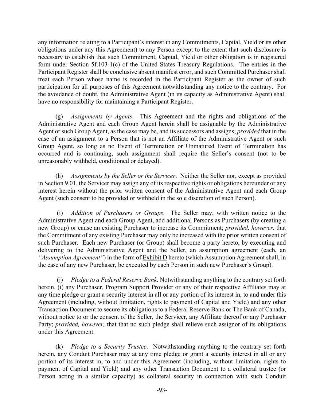 -93-与参与者在任何承诺、资本、收益率或其在任何本协议下的其他义务中的权益有关的任何信息)向任何人提供,但为证明此类承诺、资本、收益率或其他义务为根据美国财政部条例第5f.103-1(c)节的注册形式而必须进行此类披露的情况除外。参与者登记册中的记项应为无明显错误的结论性记录,且该承诺购买者应将其姓名记录在参与者登记册中的每个人视为本协议所有目的的此类参与的所有人,即使有任何相反的通知。为免生疑问,行政代理人(以行政代理人身份)不负责维护参加人名册。(g)代理人的转让。本协议以及行政代理人和本协议中各集团代理人的权利和义务,由行政代理人或该集团代理人(视情况而定)及其继承人和受让人转让;但在转让给非该行政代理人或该集团代理人的关联人的情况下,只要没有发生终止事件或未成熟的终止事件并且仍在继续,该转让应要求卖方同意(不得无理拒绝、附加条件或延迟)。(h)卖方或服务商的转让。除第9.01条规定外,卖方和服务商均不得转让其各自在本协议项下的任何权利或义务或本协议中的任何利益,而无需事先征得行政代理人和每个集团代理人的书面同意(此种同意由该人自行决定提供或拒绝提供)。(i)增加购买者或团体。卖方可在向行政代理人和每个集团代理人发出书面通知的情况下,增加额外人员作为买方(通过创建一个新的集团)或促使现有买方增加其承诺;但前提是任何现有买方的承诺只能在该买方事先书面同意的情况下才能增加。每一新的买方(或集团)应成为本协议的一方,通过签署并向行政代理人和卖方交付一份以本协议的附件 D形式的承担协议(每一份,“承担协议”)(就任何新的买方而言,该承担协议应由该新买方集团中的每个人签署)。(j)质押给联邦储备银行。尽管本协议有任何相反规定,(i)任何买方、方案支持提供商或其各自的任何关联公司可随时质押或授予其在本协议中、向本协议以及根据本协议(包括但不限于支付资本和收益率的权利)和任何其他交易文件中的全部或任何部分权益的担保权益,以担保其对联邦储备银行或加拿大银行的义务,而无需通知卖方、服务商、其任何关联公司或任何买方方或其同意;但前提是,任何该等质押均不得解除该转让人在本协议项下的义务。(k)质押给证券受托人。尽管本协议另有相反规定,任何管道买方可随时将其在本协议中、根据本协议享有的全部或任何部分权益(包括但不限于支付资本和收益率的权利)和任何其他交易文件中的担保权益质押或授予担保权益,作为与该管道有关的担保担保(或以类似身份行事的人)