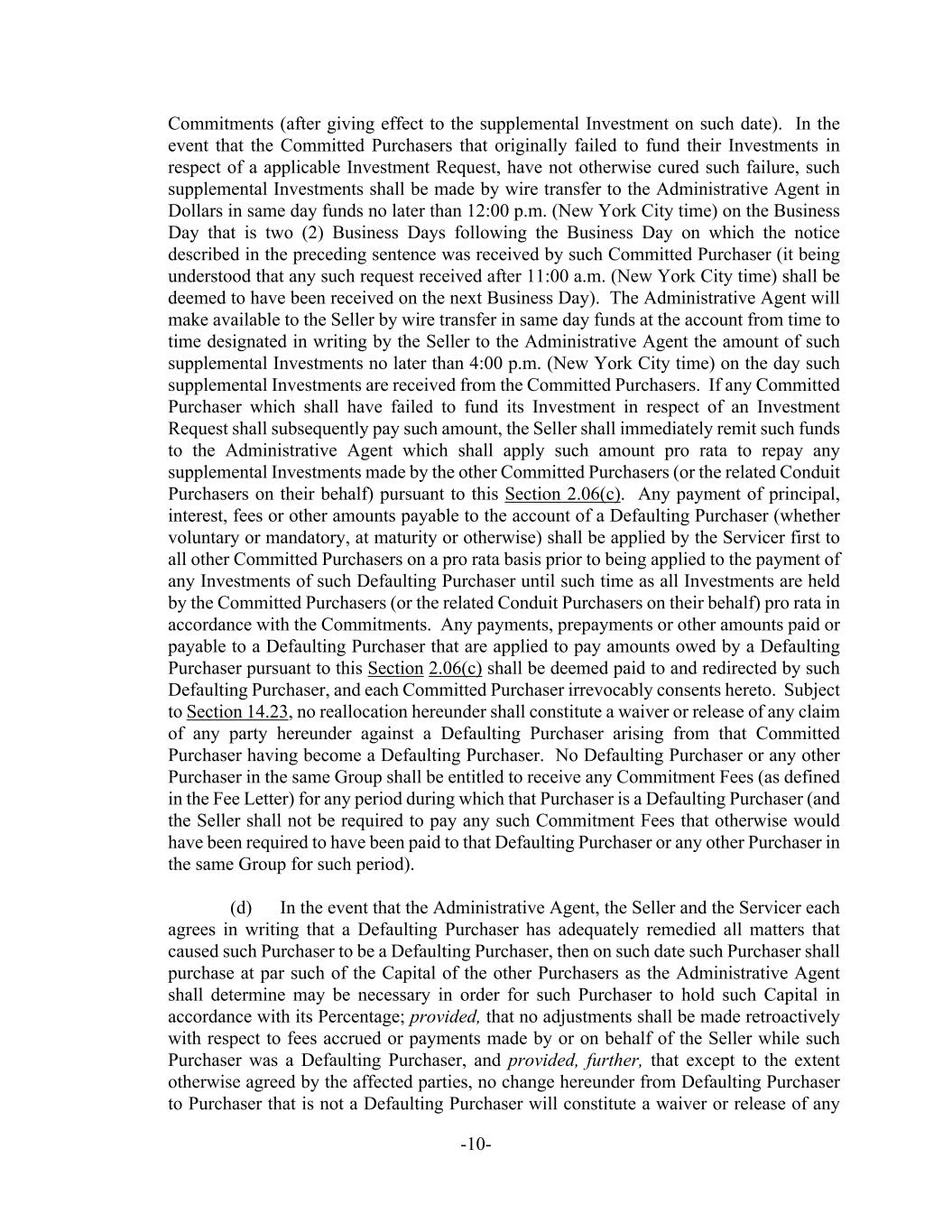 -10-承诺(在该日期使补充投资生效后)。如果最初未能就适用的投资请求为其投资提供资金的承诺购买者没有以其他方式纠正此种失败,此类补充投资应不迟于该承诺买方收到前一句所述通知的营业日之后的两(2)个营业日的下午12:00(纽约市时间)以美元电汇方式向行政代理人当日资金进行(但有一项理解,即在上午11:00(纽约市时间)之后收到的任何此类请求应被视为在下一个营业日收到)。行政代理人将不迟于下午4:00(纽约市时间)从承诺的买方收到此类补充投资之日下午4:00(纽约市时间)在卖方不时书面指定给行政代理人的账户上以当日电汇方式向卖方提供此类补充投资的金额。如果任何承诺买方未能就投资请求为其投资提供资金,随后应支付该金额,则卖方应立即将该资金汇给行政代理人,行政代理人应按比例应用该金额偿还其他承诺买方(或代表他们的相关管道买方)根据本条第2.06(c)款进行的任何补充投资。任何应付至违约买方账户的本金、利息、费用或其他金额的支付(无论是自愿的还是强制性的、在到期时或其他情况下),应由服务商先按比例向所有其他承诺的买方支付,然后再用于支付该违约买方的任何投资,直至所有投资均由承诺的买方(或代表他们的相关管道买方)按照承诺按比例持有为止。已支付或应付给违约买方的任何款项、预付款或其他款项,如适用于支付违约买方根据本条第2.06(c)款所欠款项,应被视为已支付给该违约买方并由该违约买方重新定向,且每个承诺的买方均不可撤销地同意此项协议。除第14.23条另有规定外,本协议项下的任何重新分配均不构成对本协议项下任何一方针对违约买方提出的任何索赔的放弃或解除,该违约买方已成为违约买方。任何违约买方或同一集团中的任何其他买方均无权收取该买方为违约买方的任何期间的任何承诺费(定义见费用函)(且卖方无需支付本应在该期间内支付给该违约买方或同一集团中的任何其他买方的任何此类承诺费)。(d)如果行政代理人、卖方和服务商各自书面同意违约买方已充分补救导致该买方成为违约买方的所有事项,则在该日期,该买方应按面值购买该行政代理人认为可能需要的其他买方的资本,以便该买方按照其百分比持有该资本;但,不得对在卖方为违约买方期间由卖方或代表卖方作出的应计费用或付款进行追溯调整,并进一步规定,除非受影响各方另有约定,否则本协议项下从违约买方变更为非违约买方的买方的任何变更均不构成对任何