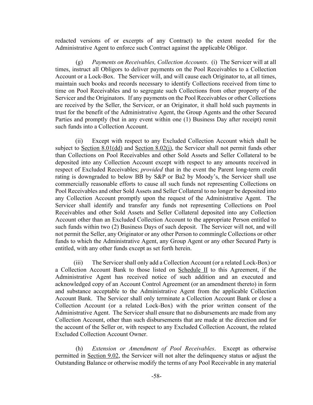 -58-任何合同的修订版本或节选),以行政代理人对适用的义务人强制执行该合同所需的范围为限。(g)应收款、收款账户的付款。(i)服务商将在任何时候指示所有义务人将集合应收账款的付款交付到收款账户或锁箱。服务商将并将促使每个发起人在任何时候维护必要的账簿和记录,以识别池应收款上不时收到的收款,并将此类收款与服务商和发起人的其他财产分开。如果卖方、服务商或发起人收到池应收款或其他收款的任何款项,则应为行政代理人、集团代理人和其他有担保方的利益以信托方式持有该等款项,并迅速(但无论如何在收到后一(1)个工作日内)将该等资金汇入收款账户。(ii)除任何受第8.01(dd)条和第8.02(j)条规限的除外收款账户外,服务商不得允许将集合应收账款和其他出售资产及卖方抵押品上的收款以外的资金存入任何收款账户,但就除外应收款收到的任何金额除外;但如果母公司的长期信用评级被标普下调至BB以下或被穆迪下调至Ba2,服务商应根据行政代理人的请求,以商业上合理的努力促使所有这些不代表集合应收账款和其他出售资产及卖方抵押品上的收款的资金不再及时存入任何收款账户。服务商应在该存款的两(2)个营业日内识别并将不代表集合应收款和其他已售资产上的收款的任何资金以及存入除除外收款账户以外的任何收款账户的卖方抵押品转移给有权获得该资金的适当人员。服务商不会、也不会允许卖方、任何发起人或任何其他人将行政代理人、任何集团代理人或任何其他有担保方有权获得的收款或其他资金与任何其他资金混合,除非本协议规定。(iii)服务人只有在行政代理人已从适用的收款账户银行收到行政代理人可接受的形式和实质的账户控制协议(或其修订)的已签署和确认副本的情况下,才应在本协议附表II所列的账户之外增加收款账户(或相关的锁箱)或收款账户银行。服务人只有在行政代理人事先书面同意的情况下,才能终止收款账户银行或关闭收款账户(或相关的锁箱)。服务商应确保不会从任何收款账户进行付款,但根据卖方的指示并为其账户进行的付款除外,或就任何除外收款账户而言,相关的除外收款账户所有者。(h)延长或修正集合应收款。除第9.02条另有许可外,服务人将不会更改任何资料中的拖欠状况或调整未清余额或以其他方式修改任何应收款池的条款