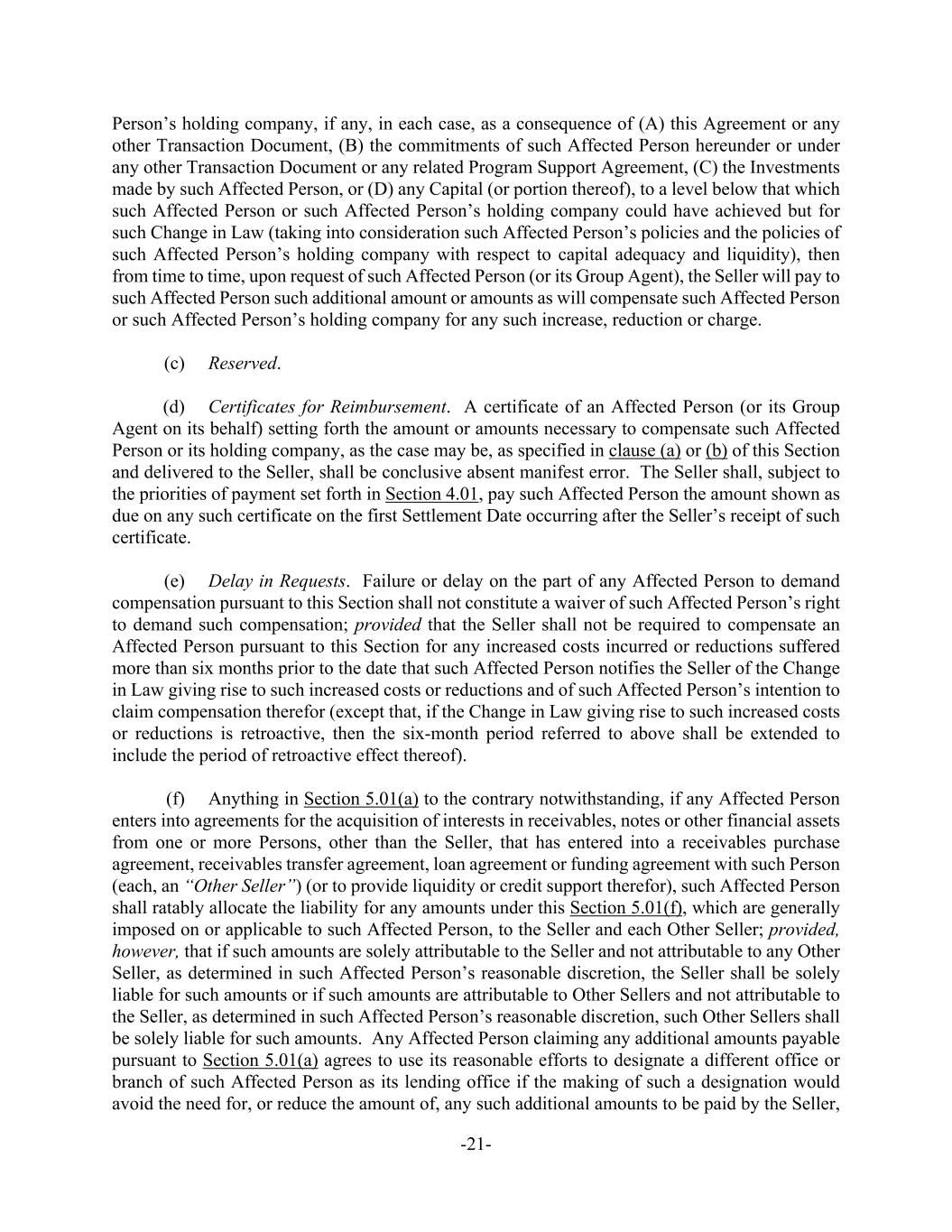 -21-个人的控股公司(如有),在每种情况下,由于(a)本协议或任何其他交易文件,(b)该受影响人根据本协议或任何其他交易文件或任何相关计划支持协议作出的承诺,(c)该受影响人作出的投资,或(d)任何资本(或其部分),至低于该受影响人士或该受影响人士的控股公司若无此类法律变更本可达到的水平(考虑到该受影响人士的政策以及该受影响人士的控股公司在资本充足率和流动性方面的政策),然后不时应该受影响人士(或其集团代理人)的要求,卖方将向该受影响人士支付额外金额,以补偿该受影响人士或该受影响人士的控股公司的任何此类增加、减少或收费。(c)保留。(d)报销证明。受影响人士(或其代表的集团代理人)的证明书,载列本条(a)或(b)条所指明的补偿该受影响人士或其控股公司(视属何情况而定)所需的一项或多于一项的金额,并交付予卖方,在没有明显错误的情况下,即为结论性证明。卖方应根据第4.01节规定的付款优先顺序,在卖方收到此类证书后发生的第一个结算日向该受影响的人支付任何此类证书上显示的到期金额。(e)请求延误。任何受影响人士未能或迟延根据本条要求赔偿,并不构成放弃该受影响人士要求该等赔偿的权利;但卖方无须根据本条向受影响人士赔偿在该受影响人士通知卖方导致该等增加的费用或减少的法律变更及该受影响人士打算就此要求赔偿的日期前超过六个月所招致或遭受的任何增加的费用或减少(但,如果导致这种增加的费用或减少的法律变更具有追溯力,则应延长上述六个月的期限,以包括其追溯效力的期限)。(f)尽管有第5.01(a)条中的任何相反规定,但如任何受影响人士订立协议,从一名或多于一名人士(卖方除外)处取得应收款、票据或其他金融资产的权益,而该人士已与该人士(各自称为“其他卖方”)订立应收款购买协议、应收款转让协议、贷款协议或融资协议(或为此提供流动性或信贷支持),则该受影响人士须按比例分配本条第5.01(f)条项下的任何金额的负债,而该等金额一般施加于该受影响人士或适用于该受影响人士,对卖方和其他卖方;但前提是,如果该等金额完全归属于卖方而不是归属于任何其他卖方,由该受影响人的合理酌情权确定,则卖方应对该等金额承担全部责任,或者如果该等金额归属于其他卖方而不是归属于卖方,则由该受影响人的合理酌情权确定,则该等其他卖方应对该等金额承担全部责任。任何声称根据第5.01(a)节应支付的任何额外款项的受影响人同意使用其合理努力指定该受影响人的不同办事处或分支机构作为其贷款办事处,如果作出此类指定将避免需要或减少卖方应支付的任何此类额外款项的金额,