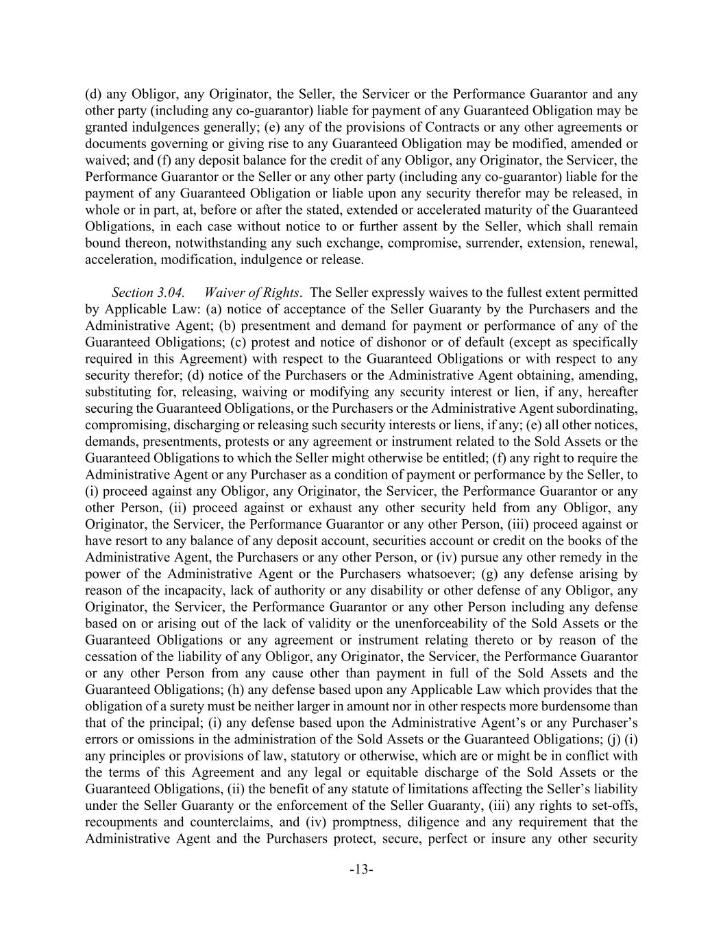-13-(d)任何债务人、任何发起人、卖方、服务人或履约担保人以及对任何担保义务负有支付责任的任何其他方(包括任何共同担保人),可一般地获得宽免;(e)可修改、修订或放弃任何合同或任何其他协议或文件的任何条款,以管辖或产生任何担保义务;及(f)任何债务人、任何发起人、服务人的信贷的任何存款余额,履约担保人或卖方或对任何担保义务的支付负有责任的任何其他方(包括任何共同担保人)或对任何担保负有责任的任何其他方(包括任何共同担保人)可在所述、延长或加速的担保义务到期时、之前或之后全部或部分解除,在每种情况下均无须通知卖方或卖方进一步同意,卖方应继续受其约束,尽管有任何此类交换、妥协、放弃、延期、展期、加速、修改、放任或解除。第3.04节。放弃权利。卖方在适用法律允许的最大范围内明确放弃:(a)买方和行政代理人接受卖方担保的通知;(b)提出并要求支付或履行任何担保义务;(c)就担保义务或就担保义务的任何担保提出抗诉和拒付或违约通知(本协议特别要求的除外);(d)买方或行政代理人获得、修改、替代、解除、放弃或修改任何担保权益或留置权(如有)的通知,以下为担保义务提供担保,或买方或行政代理人将此类担保权益或留置权(如有)置于次要地位、妥协、解除或解除;(e)与出售资产或卖方可能有权以其他方式获得的担保义务有关的所有其他通知、要求、陈述、抗议或任何协议或文书;(f)要求行政代理人或任何买方作为卖方付款或履行的条件的任何权利,以(i)对任何债务人、任何发起人、服务人、履约担保人或任何其他人进行诉讼,(ii)针对任何义务人、任何发起人、服务人、履约保证人或任何其他人所持有的任何其他担保而进行或用尽,(iii)针对或已诉诸行政代理人、买方或任何其他人的簿册上的任何存款账户、证券账户或信贷的任何余额,或(iv)寻求行政代理人或买方权力范围内的任何其他补救;(g)因任何义务人、任何发起人、服务人的无行为能力、缺乏权威或任何残疾或其他抗辩而产生的任何抗辩,履约担保人或任何其他人,包括基于或由于出售资产或所担保的义务或与之有关的任何协议或文书缺乏有效性或不可执行性而产生的任何抗辩,或由于任何义务人、任何发起人、服务人的责任终止而产生的任何抗辩,履约保证人或任何其他人因除全额支付所售资产及所担保的义务以外的任何其他原因;(h)基于任何适用法律规定的任何抗辩,其中规定担保人的义务在金额上不得大于或在其他方面不得比委托人的义务更重;(i)基于行政代理人或任何买方在管理所售资产或所担保的义务方面的错误或遗漏而进行的任何抗辩;(j)(i)法律的任何原则或规定,无论是法定的还是其他的,与本协议的条款以及出售资产或担保义务的任何合法或衡平法解除有冲突或可能有冲突,(ii)影响卖方在卖方担保下的责任或卖方担保的强制执行的任何诉讼时效的利益,(iii)任何抵销、补偿和反索赔的权利,以及(iv)及时、勤勉以及行政代理人和买方保护、确保、完善或为任何其他担保提供保险的任何要求