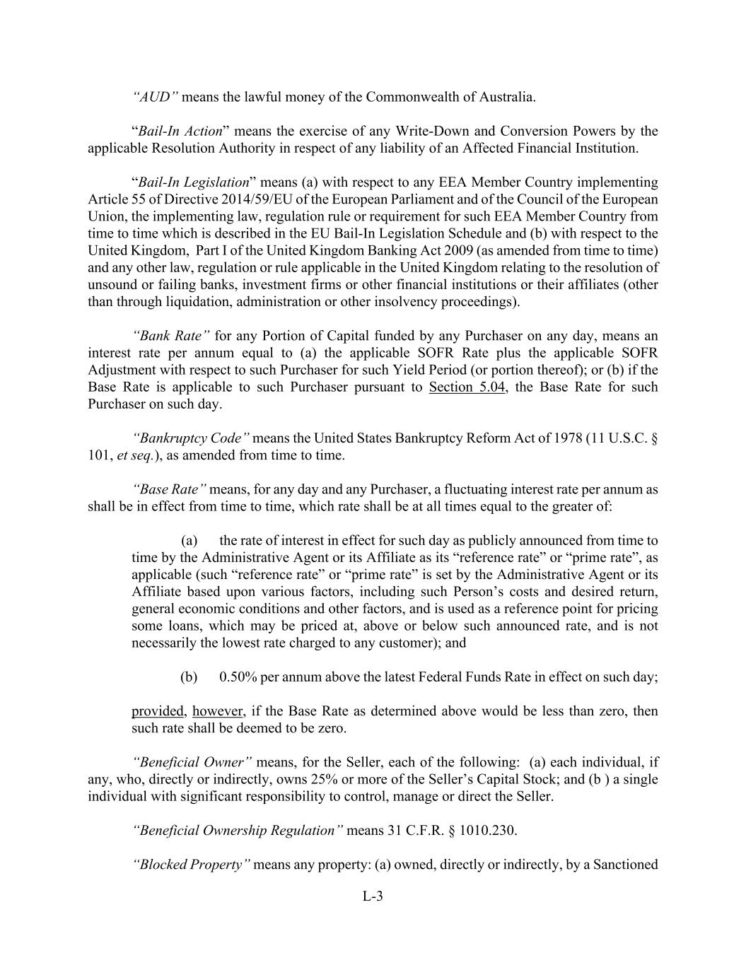 L-3“澳元”是指澳大利亚联邦的合法货币。“纾困行动”是指适用的处置当局就受影响金融机构的任何负债行使任何减记和转换权力。“纾困立法”是指(a)就执行欧洲议会和欧盟理事会第2014/59/EU号指令第55条的任何欧洲经济区成员国而言,欧盟纾困立法附表中不时描述的对该欧洲经济区成员国的实施法律、法规规则或要求,以及(b)就英国而言,《2009年英国银行法》(不时修订)第一部分以及在英国适用的与解决不健全或破产银行有关的任何其他法律、法规或规则,投资公司或其他金融机构或其关联机构(通过清算、管理或其他破产程序除外)。任何买方在任何一天出资的任何部分资本的“银行利率”是指年利率等于(a)适用的SOFR利率加上该买方在该收益期(或其部分)的适用SOFR调整;或(b)如果基本利率根据第5.04节适用于该买方,则该买方在该天的基本利率。“破产法”是指1978年《美国破产改革法》(11 U.S.C. § 101,et seq.),不时修订。“基准利率”是指,就任何一天和任何买方而言,不时生效的浮动年利率,该利率在任何时候均应等于以下两者中的较高者:(a)行政代理人或其关联机构不时作为其适用的“参考利率”或“最优惠利率”(如适用)公开宣布的当日有效利率(该“参考利率”或“最优惠利率”由行政代理人或其关联机构根据各种因素设定,包括该人员的成本和期望的回报,一般经济状况和其他因素,并作为某些贷款定价的参考点,这些贷款的定价可能高于、高于或低于该公布的利率,不一定是向任何客户收取的最低利率);(b)每年高于该日有效的最新联邦基金利率0.50%;但前提是,如果上述确定的基准利率将低于零,则该利率应被视为零。“实益拥有人”对卖方而言是指以下各项:(a)直接或间接拥有卖方股本25%或以上的每个个人(如有);(b)对控制、管理或指导卖方负有重大责任的单个个人。“实益所有权监管”是指31 C.F.R. § 1010.230。“封锁财产”是指任何财产:(a)由受制裁的人直接或间接拥有