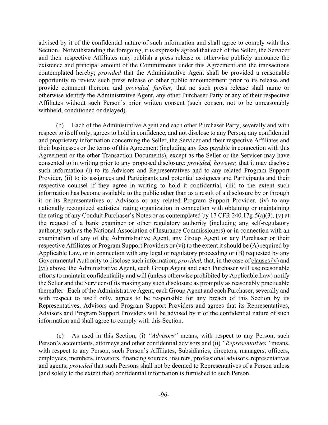 -96-由其告知此类信息的机密性质,并应同意遵守本节。尽管有上述规定,但明确同意卖方、服务商及其各自的关联公司均可发布新闻稿或以其他方式公开宣布本协议项下的承诺以及在此设想的交易的存在和本金金额;但应向行政代理人提供合理机会,在其发布前审查该新闻稿或其他公告并就其提供评论意见;并进一步规定,该新闻稿不得指定或以其他方式指明该行政代理人,任何其他买方或其各自的任何关联公司未经该人事先书面同意(此种同意不得被无理拒绝、附加条件或延迟)。(b)每一行政代理人和彼此的买方当事人,分别且仅就其本身而言,同意以保密方式持有,而不向任何人披露有关卖方、服务商及其各自关联公司及其业务或本协议条款的任何机密和专有信息(包括与本协议或其他交易文件有关的任何应付费用),但卖方或服务商在任何拟议披露之前可能已书面同意的除外;但前提是,它可以(i)向其顾问和代表以及任何相关的方案支持提供者披露此类信息,(ii)向其受让人和参与者以及潜在受让人和参与者及其各自的律师披露(如果他们书面同意对其保密),(iii)在此类信息已向公众提供的范围内,而不是由于它或其代表或顾问或任何相关的方案支持提供者披露或通过其披露,(iv)向任何国家认可的统计评级组织就取得或维持任何导管购买者票据的评级或根据17 CFR 240.17g-5(a)(3)的设想,(v)应银行审查员或其他监管机构(包括全国保险专员协会等任何自律管理机构)的要求,或就对任何行政代理人、任何集团代理人或任何购买者或其各自的关联公司或计划支持提供者的审查有关,或(vi)在适用法律应(a)要求的范围内,或与任何法律或监管程序有关,或与任何政府当局要求披露此类信息的(b)项有关;条件是,在上述第(v)和(vi)条的情况下,行政代理人、每一集团代理人和每一买方将尽合理努力保持机密性,并将(除非适用法律另有禁止)在此后合理可行的情况下尽快通知卖方和服务商其作出任何此类披露。每一行政代理人、每一集团代理人和每一买方,分别且仅就其本身而言,同意对其代表、顾问和方案支持提供者违反本节的任何行为负责,并同意其代表、顾问和方案支持提供者将被告知此类信息的保密性质,并应同意遵守本节。(c)如本条所用,(i)“顾问”就任何人而言是指该人的会计师、律师和其他保密顾问,(ii)“代表”就任何人而言是指该人的关联公司、子公司、董事、经理、高级职员、雇员、成员、投资者、融资来源、保险人、专业顾问、代表和代理人;但除非(且仅限于)向该人提供机密信息,否则该等人不得被视为某人的代表。