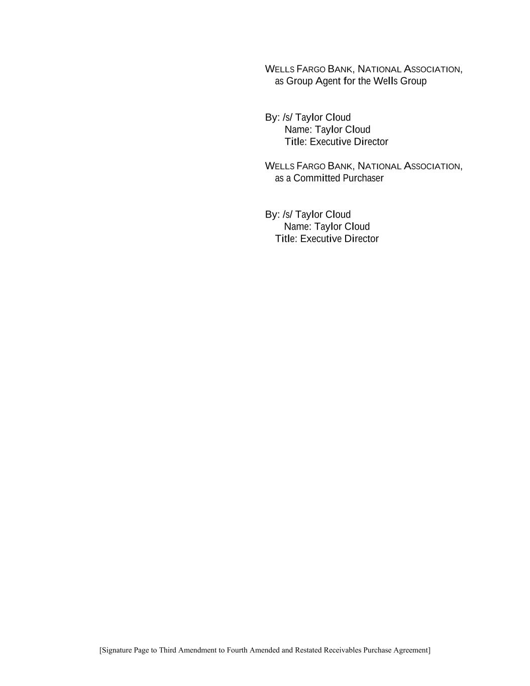 【第四次修订和重述的应收账款购买协议第三次修订的签署页】Wells Fargo BANK,National Association,as Group Agent for the Wells Group by:/s/Taylor Cloud Name:Taylor Cloud Title:Executive Director Wells Fargo BANK,National Association,as a Committed Purchaser by:/s/Taylor Cloud Name:Taylor Cloud Title:Executive Director