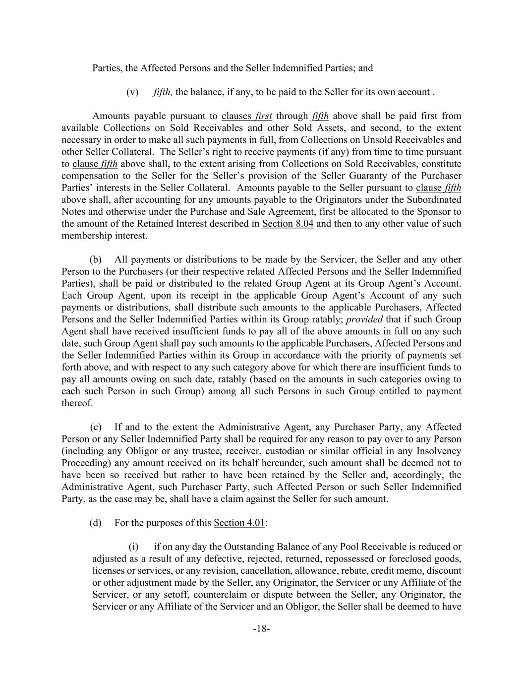 -18-各方、受影响人士及卖方获弥偿方;及(v)第五,余额(如有的话)须支付予卖方为其自己的帐户。根据上述第一至第五条应付的金额应首先从已售应收款和其他已售资产的可用收款中支付,其次,在必要的范围内,为了全额支付所有此类付款,应从未售应收款和其他卖方抵押品的收款中支付。卖方根据上述第5条不时收取付款(如有)的权利,在已售应收款项上产生的范围内,应构成对卖方就买方当事人在卖方担保物上的权益提供卖方担保的对卖方的补偿。根据上述第5条应付给卖方的金额,在计入根据次级票据或根据买卖协议应付给发起人的任何金额后,应首先分配给保荐人,金额为第8.04节所述的保留权益金额,然后分配给此类会员权益的任何其他价值。(b)由服务商、卖方及任何其他人向买方(或其各自的相关受影响人士及卖方获弥偿方)作出的所有付款或分派,均须在其集团代理的账户上支付或分派予相关集团代理。各集团代理人在其在适用的集团代理人账户中收到任何此类付款或分配后,应按比例将该等金额分配给其集团内的适用买方、受影响人员和卖方受赔方;但如果该集团代理人在任何该等日期收到的资金不足以全额支付上述所有金额,则该集团代理人应按照上述付款的优先顺序将该等金额支付给其集团内的适用买方、受影响人员和卖方受赔方,以及就上述任何类别,如没有足够资金支付在该日期的所有欠款,则在该类别中所有有权获得付款的人之间按比例(基于该类别中欠该类别中每个该等人的款项)支付。(c)如行政代理人、任何买方一方、任何受影响人士或任何卖方获弥偿方因任何理由被要求向任何人(包括任何债务人或任何破产程序中的任何受托人、接管人、托管人或类似官员)支付根据本协议代其收取的任何款项,则该款项应被视为未如此收取,而是已由卖方保留,因此,行政代理人、该买方一方、该受影响人士或该卖方获弥偿方(视情况而定),应就该金额向卖方提出索赔。(d)就本条第4.01条而言:(i)如在任何一天,任何集合应收款的未偿余额因卖方、任何发起人、服务商或服务商的任何关联公司作出的任何有缺陷、被拒绝、退回、被收回或被取消赎回权的货物、许可证或服务,或任何修订、取消、津贴、回扣、信用备忘录、折扣或其他调整,或卖方、任何发起人、服务商或服务商的任何关联公司与债务人之间的任何抵销、反索赔或争议而减少或调整,则卖方应被视为已