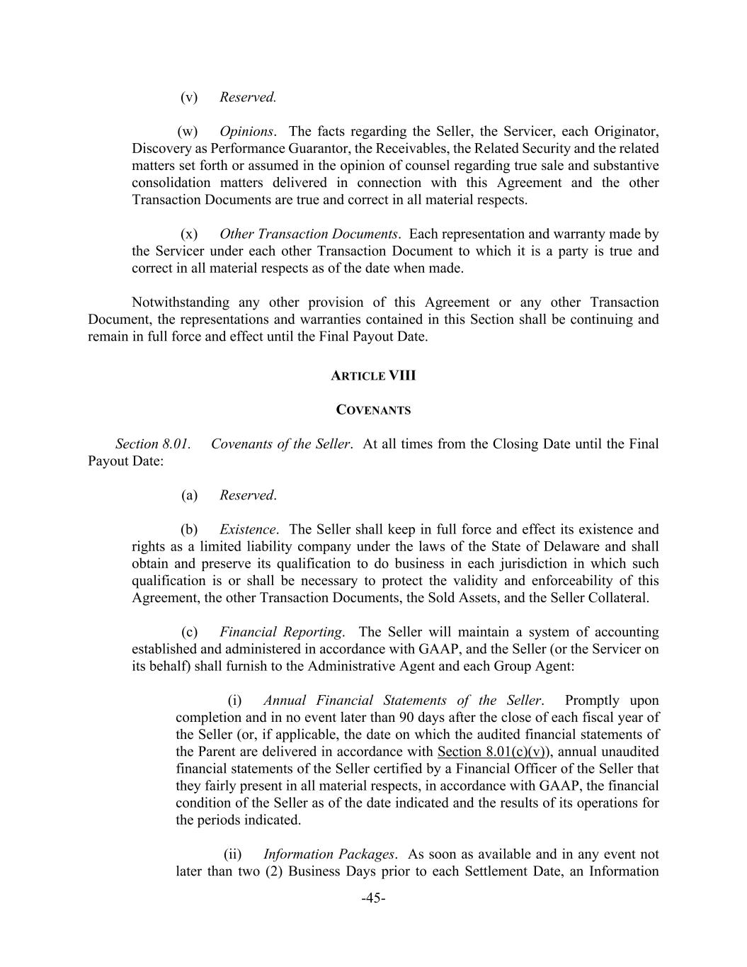 -45-(v)保留。(w)意见。有关卖方、服务商、各发起人、Discovery作为履约担保人、应收款项、相关担保以及大律师认为就本协议和其他交易文件交付的真实销售和实质性合并事项所列或承担的相关事项的事实在所有重大方面均真实、正确。(x)其他交易文件。服务商根据其作为一方当事人的相互交易文件作出的每一项陈述和保证,在作出之日的所有重大方面都是真实和正确的。尽管有本协议或任何其他交易文件的任何其他规定,本节所载的陈述和保证应继续进行,并保持完全有效,直至最后付款日期。第八条盟约第8.01节。卖方的契约。在截止日至最后支付日的所有时间:(a)保留。(b)存在。卖方应根据特拉华州法律保持其作为有限责任公司的存在和权利的充分效力和效力,并应获得并保留其在该资格是或将是必要的每个司法管辖区开展业务的资格,以保护本协议、其他交易文件、出售资产和卖方抵押品的有效性和可执行性。(c)财务报告。卖方将维持根据公认会计原则建立和管理的会计制度,卖方(或代表其的服务商)应向行政代理人和每个集团代理人提供:(i)卖方的年度财务报表。在完成时立即且在任何情况下不迟于卖方每个财政年度结束后的90天(或如适用,根据第8.01(c)(v)节交付母公司的已审计财务报表之日),卖方的年度未经审计财务报表经卖方财务官证明,它们在所有重大方面按照公认会计原则公允地反映了卖方截至所示日期的财务状况及其所示期间的经营业绩。(二)信息包。在任何情况下不迟于每个结算日期前两(2)个营业日尽快提供一份资料