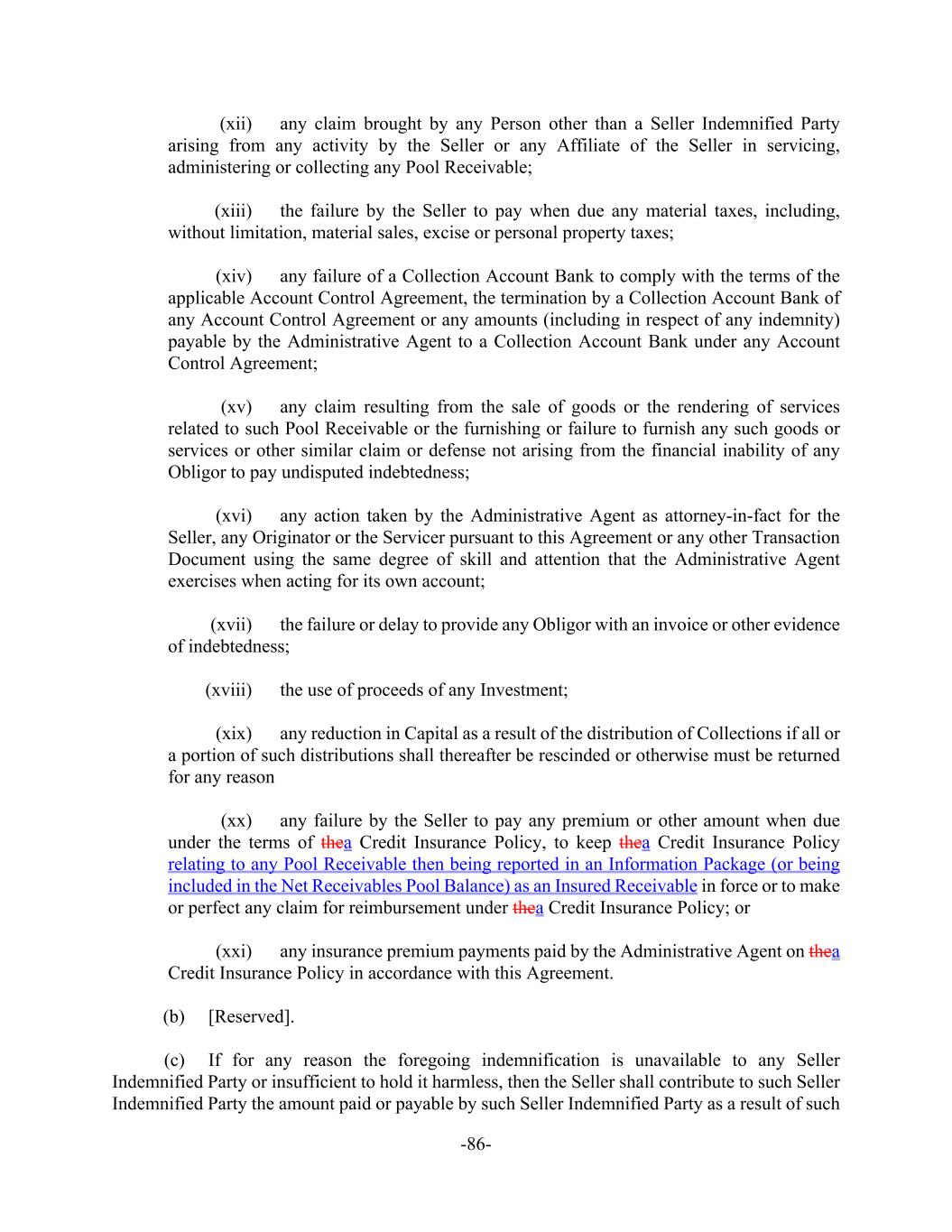 -86-(xii)因卖方或卖方的任何关联公司在服务、管理或收取任何应收款项池方面的任何活动而由卖方受偿方以外的任何人提出的任何索赔;(xiii)卖方未能在到期时支付任何实质性税款,包括但不限于材料销售、消费税或个人财产税;(xiv)收款账户银行未能遵守适用的账户控制协议的条款,收款账户银行终止任何账户控制协议或行政代理人根据任何账户控制协议向收款账户银行支付的任何金额(包括任何赔偿);(xv)因销售货物或提供与该集合应收款有关的服务或提供或未能提供任何该等货物或服务而产生的任何索赔或其他类似索赔或抗辩,而非因任何债务人的财务无力支付无可争议的债务而产生;(xvi)行政代理人作为卖方的实际代理人采取的任何行动,任何发起人或服务人根据本协议或任何其他交易文件使用行政代理人在为其自己的账户行事时所行使的同等程度的技能和关注;(xvii)未能或延迟向任何债务人提供发票或其他债务证据;(xviii)任何投资的收益使用;(xix)因分配藏品而导致的任何资本减少如果此后此类分配的全部或部分应被撤销或因任何原因必须以其他方式退还(xx)卖方未能根据信用保险单的条款在到期时支付任何保费或其他金额,保持与随后在信息包中报告(或包含在应收账款净额池余额中)的任何应收款项池有关的信用保险单有效,或根据信用保险单提出或完善任何报销索赔;或(xxi)行政代理人根据本协议就信用保险单支付的任何保险费。(b)[保留]。(c)如果由于任何原因,任何卖方受赔偿方无法获得上述赔偿或不足以使其免受损害,则卖方应向该卖方受赔偿方提供该卖方受赔偿方因该等原因而支付或应付的金额
