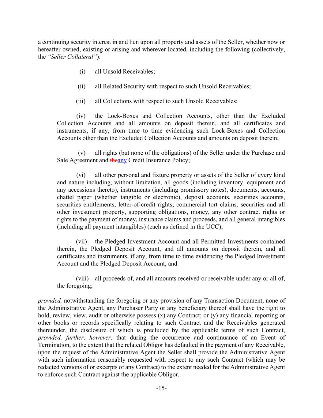 -15-对卖方的所有财产和资产的持续担保权益和留置权,无论是现在或以后拥有的、现有的或产生的以及位于何处,包括以下各项(统称为“卖方抵押品”):(i)所有未售出的应收款项;(ii)与此类未售出的应收款项有关的所有相关担保;(iii)与此类未售出的应收款项有关的所有收款;(iv)锁箱和收款账户,但除外收款账户和存入其中的所有金额除外,以及所有凭证和票据(如有),不时证明除除外收款账户及存放于其中的金额以外的该等锁箱及收款账户;(v)卖方在买卖协议及任何信用保险单项下的所有权利(但不包括任何义务);(vi)卖方的所有其他各类和性质的个人和固定装置财产或资产,包括但不限于所有货物(包括库存品、设备及其任何加入)、票据(包括期票)、文件、账户、动产票据(无论是有形的还是电子的)、存款账户、证券账户、证券权利、信用证权利、商业侵权索赔,证券及所有其他投资财产、配套债务、金钱、任何其他合同权利或对金钱的付款权利、保险索赔和收益,以及所有一般无形资产(包括所有付款无形资产)(每一项均在UCC中定义);(vii)质押投资账户及其中所载的所有许可投资、质押存款账户、以及存放于其中的所有金额,以及不时证明质押投资账户及质押存款账户的所有凭证和票据(如有);及(viii)上述任何一项或全部的所有收益、以及根据任何一项或全部已收或应收的所有金额;但,尽管有上述规定或任何交易文件的任何规定,行政代理人、任何买方一方或其任何受益人均无权持有、审查、查看、审计或以其他方式拥有(x)任何合同;或(y)任何财务报告或其他账簿或记录,具体涉及该合同以及根据该合同产生的应收款项,但该合同的适用条款不允许披露这些账簿或记录,但进一步规定,在终止事件发生和持续期间,只要相关债务人拖欠任何应收款项,应行政代理人的请求,卖方应向行政代理人提供就任何此类合同(可能是任何合同的编辑版本或节选)合理要求的信息,以供行政代理人对适用的义务人执行此类合同所需。