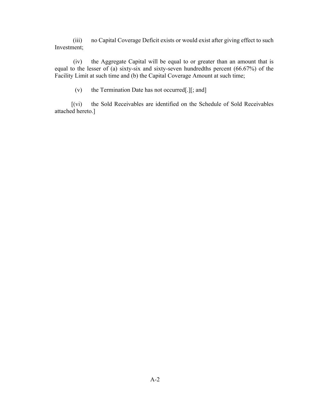 A-2(iii)不存在或在此类投资生效后将存在资本覆盖赤字;(iv)总资本将等于或大于等于(a)当时融资限额的百分之六十六和六十七(66.67%)和(b)当时资本覆盖金额中较低者的金额;(v)终止日期未发生[. ] [;] [(vi)已售应收款项已在本协议所附的已售应收款项附表中确定。]