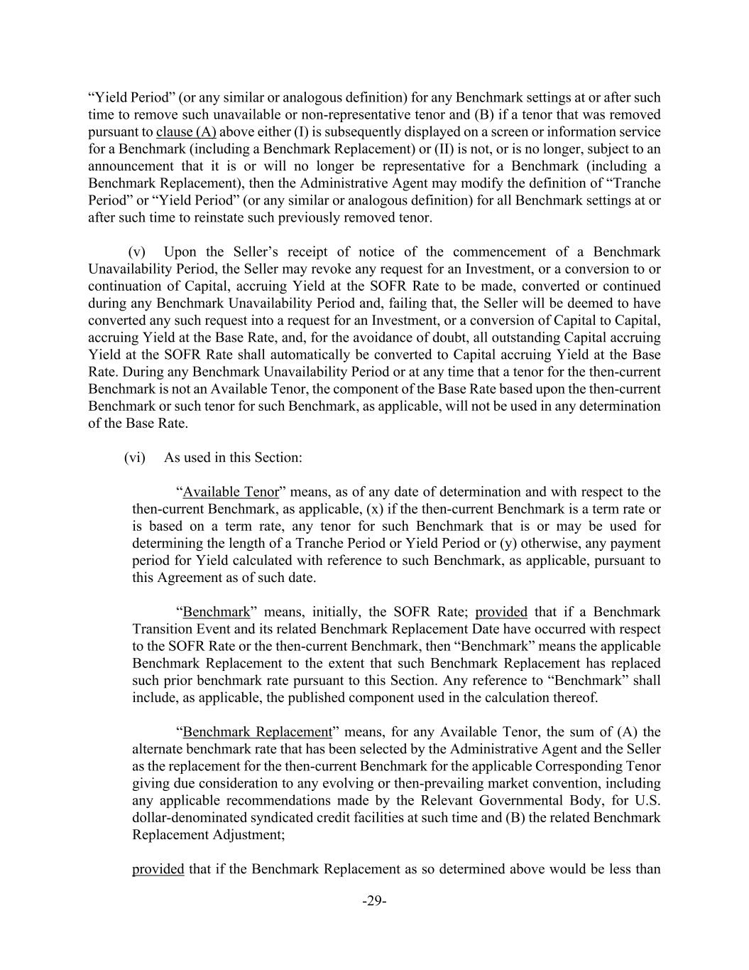 -29-在该时间或之后的任何基准设置的“收益期”(或任何类似或类似的定义),以删除此类不可用或不具代表性的期限,以及(b)如果根据上述(i)条中的(a)项被删除的期限随后显示在基准(包括基准替换)的屏幕或信息服务上,或(II)不再或不再受其现在或将不再具有基准(包括基准替换)代表性的公告的约束,然后,行政代理人可以在该时间或之后修改所有基准设置的“分档期”或“收益期”(或任何类似或类似的定义)的定义,以恢复该先前取消的期限。(v)在卖方收到基准不可用期开始的通知后,卖方可撤销任何投资请求,或转换为或延续资本、在任何基准不可用期内将作出、转换或延续的按SOFR利率累积收益率的请求,否则,卖方将被视为已将任何此类请求转换为投资请求,或将资本转换为资本、按基准利率累积收益率,为免生疑问,所有按SOFR利率计算的未偿资本应计收益率应自动转换为按基准利率计算的资本应计收益率。在任何基准不可用期间或在当时现行基准的期限不是可用期限的任何时候,将不会在任何确定基准利率时使用基于当时现行基准的基本利率组成部分或适用的此类基准的此类期限。(vi)如本节所用:“可用期限”是指,截至任何确定日期,并就当时的基准(如适用)而言,(x)如果当时的基准是定期利率或基于定期利率,则该基准的任何期限,即目前或可能用于确定分档期或收益期长度的任何期限,或(y)其他情况下,截至该日期根据本协议根据适用的该基准计算的收益率的任何付款期。“基准”最初是指SOFR费率;前提是,如果就SOFR费率或当时的基准发生了基准过渡事件及其相关的基准更换日期,那么“基准”是指适用的基准更换,前提是此类基准更换已根据本节取代了此类先前的基准费率。凡提及“基准”,应酌情包括计算基准时使用的已公布成分。“基准替代”是指,就任何可用的期限而言,(a)行政代理人和卖方在适当考虑任何演变中或当时盛行的市场惯例(包括相关政府机构提出的任何适用建议)的情况下选择的替代基准利率作为当时适用的相应期限的替代基准的总和,用于当时以美元计价的银团信贷便利,以及(b)相关的基准替代调整;但前提是,如果上述确定的基准替代将低于