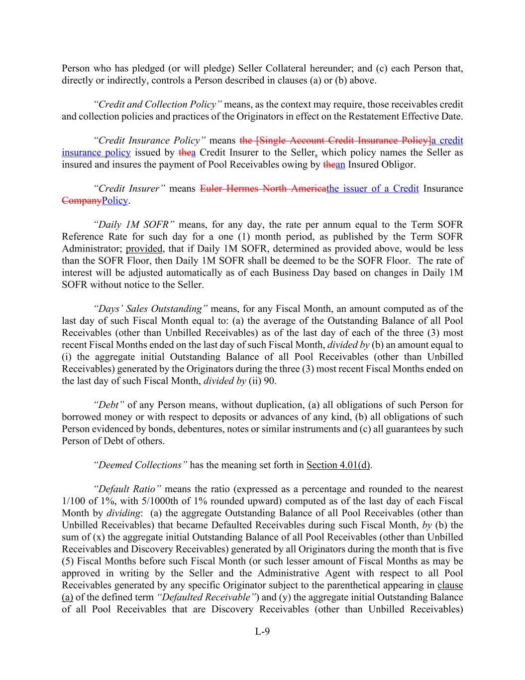 L-9已在本协议项下质押(或将质押)卖方抵押品的人;及(c)直接或间接控制上述(a)或(b)条所述的人的每一人。“信贷和催收政策”是指,根据上下文可能需要,那些在重述生效日期生效的应收款项信贷和发起人的催收政策和做法。“信用保险单”是指[单一账户信用保险单]信用保险公司向卖方签发的信用保险单,该保单将卖方列为被保险人,并为受保义务人所欠的集合应收账款的支付提供保险。“信用保险商”是指欧拉爱马仕北美信用保险公司保单的发行人。“每日1M SOFR”是指,就任何一天而言,每年的费率等于该日期一(1)个月期间的定期SOFR参考利率,由定期SOFR管理人公布;但前提是,如果按上述规定确定的每日1M SOFR将低于SOFR下限,则每日1M SOFR应被视为SOFR下限。利率将根据每日1M SOFR的变化自每个工作日起自动调整,恕不通知卖方。“未结清销售天数”是指,就任何一个会计月份而言,截至该会计月份最后一天计算的金额等于:(a)截至该会计月份最后一天的最近三(3)个会计月份中的每一个会计月份的最后一天,所有集合应收账款(未开票应收账款除外)的未结清余额的平均值,除以(b)等于(i)发起人在该财政月最后一天结束的最近三(3)个财政月内产生的所有集合应收账款(未开票应收账款除外)的初始未偿余额总额的金额,除以(ii)90。任何人的“债务”在不重复的情况下是指(a)该人对所借款项或任何种类的存款或垫款的所有义务,(b)该人以债券、债权证、票据或类似票据为证据的所有义务,以及(c)该人对他人债务的所有担保。“视同收藏”具有第4.01(d)节规定的含义。“违约率”是指截至每个财政月最后一天计算的比率(以百分比表示并四舍五入到最接近的1%的1/100,其中1%的5/1000向上四舍五入),除以:(a)在该财政月期间成为违约应收款的所有集合应收款(未开票应收款除外)的未偿余额总额,由(b)(x)所有发起人在该财政月前五(5)个财政月(或卖方和行政代理人可能以书面批准的较少数额的财政月)内产生的所有集合应收款(未开票应收款和Discovery应收款除外)的所有集合应收款(未开票应收款和Discovery应收款除外)的总初始未偿余额的总和(x)和(y)所有集合应收款的总初始未偿余额的总和属于Discovery应收款(未开票应收款除外)