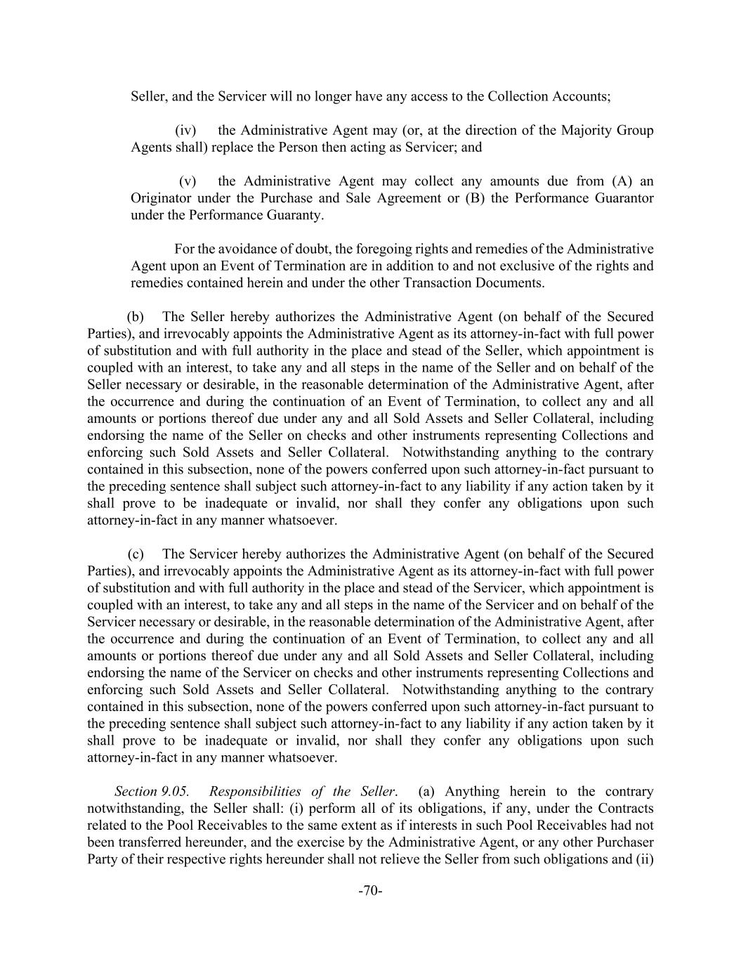 -70-卖方,且服务人将不再有权使用收款账户;(iv)行政代理人可(或在多数群体代理人的指示下)更换当时担任服务人的人;及(v)行政代理人可向(a)买卖协议项下的发起人或(b)履约保证项下的履约保证人收取任何应付款项。为免生疑问,行政代理人在发生终止事项时的前述权利和救济是对本协议所载权利和其他交易单证项下的权利和救济的补充,而不是排除。(b)卖方特此授权行政代理人(代表有担保方),并不可撤销地指定行政代理人为其事实上的代理人,具有完全的替代权力并在与利益相关联的卖方的位置和代替上拥有完全的权力,在行政代理人的合理确定下,在终止事件发生后和继续期间,以卖方的名义和代表卖方采取必要或可取的任何和所有步骤,收取任何和所有已售资产和卖方抵押品下到期的任何和所有金额或部分,包括在支票和其他代表收款的票据上背书卖方的名称,并强制执行此类已售资产和卖方抵押品。尽管本款另有相反规定,任何依据前一句赋予该事实上的代理人的权力,如证明该事实上的代理人所采取的任何行动是不适当或无效的,则不得使该事实上的代理人承担任何法律责任,亦不得以任何方式赋予该事实上的代理人任何义务。(c)服务人特此授权行政代理人(代表有担保当事人),并不可撤销地指定行政代理人为其事实上的代理人,具有完全的替代权力,并在与利益相关联的服务人的位置和代替上拥有完全的权力,在行政代理人的合理确定下,在终止事件发生后和继续期间,以服务人的名义和代表服务人采取必要或可取的任何和所有步骤,收取任何和所有已售资产和卖方抵押品下到期的任何和所有金额或部分,包括在支票和其他代表收款的票据上背书服务商的名称,并强制执行此类已售资产和卖方抵押品。尽管本款另有相反规定,依据前一句授予该事实上的代理人的任何权力,如证明该事实上的代理人所采取的任何行动是不适当或无效的,则不得使该事实上的代理人承担任何法律责任,亦不得以任何方式赋予该事实上的代理人任何义务。第9.05节。卖方的责任。(a)尽管本协议中有任何相反的规定,卖方仍应:(i)履行其在与集合应收款有关的合同项下的所有义务(如有),其程度与该集合应收款的权益未根据本协议转让的程度相同,而行政代理人或任何其他买方方行使其各自在本协议项下的权利不应解除卖方的此类义务,并且(ii)