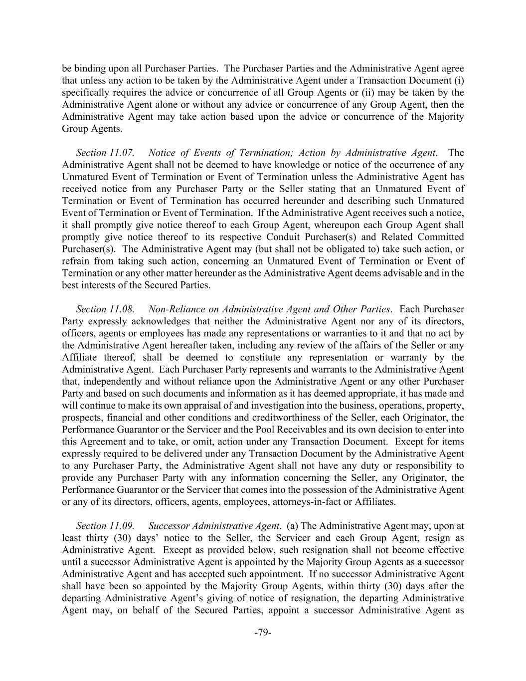 -79-对所有采购方均具有约束力。买方各方和行政代理人同意,除非行政代理人根据交易文件(i)具体要求所有集团代理人的建议或同意或(ii)可能由行政代理人单独或未经任何集团代理人的任何建议或同意而采取的任何行动,则行政代理人可根据多数集团代理人的建议或同意采取行动。第11.07节。终止事项通知;行政代理人行为。行政代理人不得被视为知悉或通知任何未成熟的终止事件或终止事件的发生,除非行政代理人已收到任何买方一方或卖方的通知,说明本协议项下已发生未成熟的终止事件或终止事件,并描述该未成熟的终止事件或终止事件。行政代理人收到此种通知的,应当及时向各集团代理人发出通知,据此,各集团代理人应当及时向各自的管道购买者和相关的承诺购买者发出通知。行政代理人可以(但不承担义务)就未成熟的终止事件或终止事件或本协议项下任何其他事项采取或不采取行政代理人认为可取且符合有担保当事人最佳利益的行动。第11.08节。不依赖行政代理人和其他当事人。各买方明确承认,行政代理人或其任何董事、高级职员、代理人或雇员均未向其作出任何陈述或保证,且行政代理人此后采取的任何行为,包括对卖方或其任何关联机构事务的任何审查,均不应被视为构成行政代理人的任何陈述或保证。每一买方向行政代理人声明并保证,独立且不依赖行政代理人或任何其他买方并基于其认为适当的文件和信息,其已并将继续对卖方、各发起人、履约担保人或服务商和集合应收款的业务、运营、财产、前景、财务和其他条件和信誉作出自己的评估和调查,并自行决定订立本协议,并根据任何交易文件采取或不采取行动。除行政代理人根据任何交易文件明确要求交付给任何买方一方的物品外,行政代理人没有任何义务或责任向任何买方一方提供行政代理人或其任何董事、高级职员、代理人、雇员、事实上的律师或关联公司所掌握的有关卖方、任何发起人、履约保证人或服务人的任何信息。第11.09节。继任行政代理人。(a)行政代理人可在至少提前三十(30)天通知卖方、服务人和各集团代理人后辞去行政代理人职务。除下文另有规定外,该辞呈须待继任行政代理人获多数群体代理人委任为继任行政代理人并接受该委任后,方告生效。多数群体代理人未指定继任行政代理人的,离任行政代理人发出离职通知后三十(30)日内,离任行政代理人可以代表有担保当事人指定继任行政代理人为