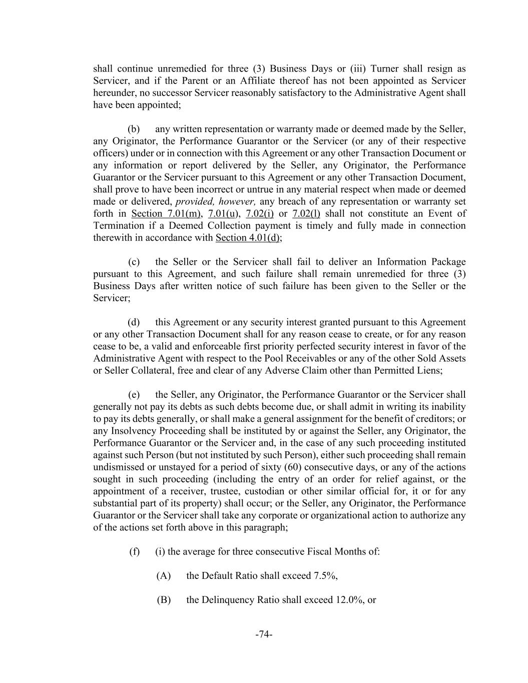-74-应继续无补救三(3)个工作日或(iii)特纳应辞去服务人职务,如果母公司或其关联公司未根据本协议被任命为服务人,则不得任命行政代理人合理满意的继任服务人;(b)卖方、任何发起人、履约担保人或服务人(或其各自的任何高级管理人员)根据本协议或任何其他交易文件作出或视为作出的任何书面陈述或保证,或卖方、任何发起人交付的任何信息或报告,履约担保人或服务商根据本协议或任何其他交易文件,在作出或被视为作出或交付时,应证明在任何重大方面是不正确或不真实的,但前提是,如果根据第4.01(d)节及时和充分地支付了与此相关的视为收款付款,则任何违反第7.01(m)、7.01(u)、7.02(i)或7.02(l)节中规定的任何陈述或保证的行为均不构成终止事件;(c)卖方或服务商应未能根据本协议交付信息包,且在向卖方或服务商发出有关该等失败的书面通知后,该等失败应在三(3)个工作日内仍未得到补救;(d)本协议或根据本协议或任何其他交易文件授予的任何担保权益应因任何原因停止产生,或因任何原因停止产生有利于行政代理人的有效且可执行的第一优先权完善的担保权益,就集合应收款或任何其他已售资产或卖方抵押品而言,(e)卖方、任何发起人、履约担保人或服务人一般不得在该等债务到期时偿付其债务,或须书面承认其一般无法偿付其债务,或须为债权人的利益作出一般转让;或任何破产程序须由卖方、任何发起人、履约担保人或服务人提起或针对该等人提起,如属针对该等人提起的任何该等程序(但并非由该人提起),该等程序须在连续六十(60)天期间内保持不被驳回或未中止,或该等程序中寻求的任何诉讼(包括输入针对其或其财产的任何实质部分的救济令,或委任接管人、受托人、保管人或其他类似官员)均会发生;或卖方、任何发起人,履约保证人或服务人应采取任何公司或组织行动授权本款上述任何行动;(f)(i)连续三个会计月的平均值:(a)违约率超过7.5%,(b)拖欠率超过12.0%,或
