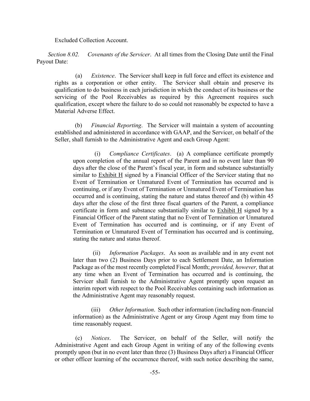 -55-排除收款账户。第8.02节。服务者的盟约。在截止日期至最后支付日期的所有时间:(a)存在。服务商应保持充分的效力,并使其作为公司或其他实体的存在和权利生效。服务商应获得并保留其在本协议要求的其业务开展或应收款项池服务需要此种资格的每个法域开展业务的资格,除非无法合理地预期未能这样做会产生重大不利影响。(b)财务报告。服务商将维护根据公认会计原则建立和管理的会计制度,服务商应代表卖方向行政代理人和每个集团代理人提供:(i)合规证书。(a)在母公司的年度报告完成后立即且在任何情况下均不迟于母公司的财政年度结束后90天的合规证书,其形式和实质内容与由服务商的财务官签署的附件 H基本相似,说明没有发生任何终止事件或未成熟的终止事件并仍在继续,或者如果任何终止事件或未成熟的终止事件已发生并仍在继续,说明其性质和状态,以及(b)在母公司前三个财政季度结束后的45天内,由母公司的财务官签署形式和实质上与附件 H基本相似的合规证明,说明没有发生任何终止事件或终止的未成熟事件并仍在继续,或者如果任何终止事件或终止的未成熟事件已发生并仍在继续,说明其性质和状态。(二)信息包。尽快提供并无论如何不迟于每个结算日期前两(2)个工作日的信息包;但条件是,在终止事件已经发生并仍在继续的任何时间,服务人应应要求立即向行政代理人提供关于集合应收款的临时报告,其中应载有行政代理人合理要求的信息。(三)其他信息。行政代理人或任何集团代理人可能不时合理要求的其他信息(包括非财务信息)。(c)通知。服务商将代表卖方,在(但在任何情况下不迟于三(3)个工作日后)财务官员或其他官员获悉发生以下任何事件时立即(但不迟于)以书面形式通知行政代理人和每个集团代理人,并附有描述相同情况的通知,