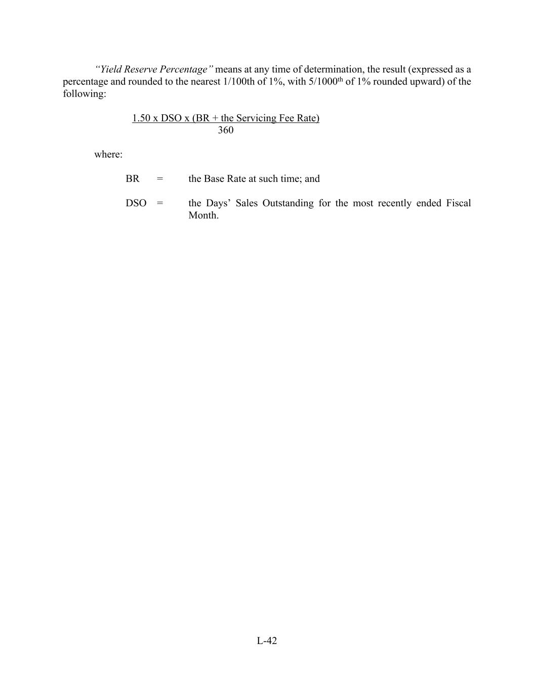 L-42“产量准备金百分比”是指在确定的任何时间,结果(以百分比表示并四舍五入到1%的最接近的1/100,其中1%的5/1000向上四舍五入)如下:1.50 x DSO x(BR +服务费率)360其中:BR =当时的基准费率;DSO =最近结束的财政月份的未偿销售天数。