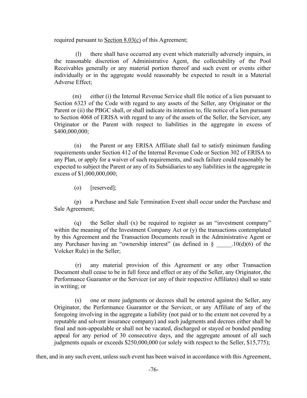 -76-根据本协议第8.03(c)节的要求;(l)应发生任何对集合应收账款的一般或其任何重要部分的可收回性产生重大不利影响的事件,行政代理人可合理地酌情决定,而此类事件或事件单独或合计将合理地预期会导致重大不利影响;(m)任一(i)国内税务局应根据《守则》第6323条就卖方、任何发起人或母公司的任何资产提交留置权通知,或(ii)PBGC应,或应表明其打算,根据ERISA第4068条就卖方、服务商、任何发起人或母公司的任何资产提交留置权通知,涉及总额超过400,000,000美元的负债;(n)母公司或任何ERISA关联公司不得满足《国内税收法》第412条或ERISA第302条对任何计划的最低资金要求,或申请放弃此类要求,并且可以合理地预期这种失败将使母公司或其任何子公司承担总额超过1,000,000,000美元的任何负债;(o)[保留];(p)根据买卖协议将发生买卖终止事件;(q)卖方应(x)被要求注册为《投资公司法》所指的“投资公司”或(y)本协议所设想的交易交易文件导致行政代理人或任何买方在卖方中拥有“所有权权益”(定义见Volcker规则第____10(d)(6)条);(r)本协议或任何其他交易文件的任何重要条款将不再具有完全效力和效力,或卖方、任何发起人、履约担保人或服务商(或其各自的任何关联公司)中的任何一方应以书面说明;或(s)应针对卖方、任何发起人、履约担保人或服务商作出一项或多项判决或法令,或上述任何一项的任何关联公司涉及合计一项责任(未支付或在信誉良好且有偿付能力的保险公司未涵盖的范围内)以及此类判决和法令,要么是最终的、不可上诉的,要么不得在任何连续30天的期间内被撤销、解除或中止或保税等待上诉,所有此类判决的总金额等于或超过250,000,000美元(或仅就卖方而言,为15,775美元);然后,在任何此类情况下,除非已根据本协议放弃此类事件,
