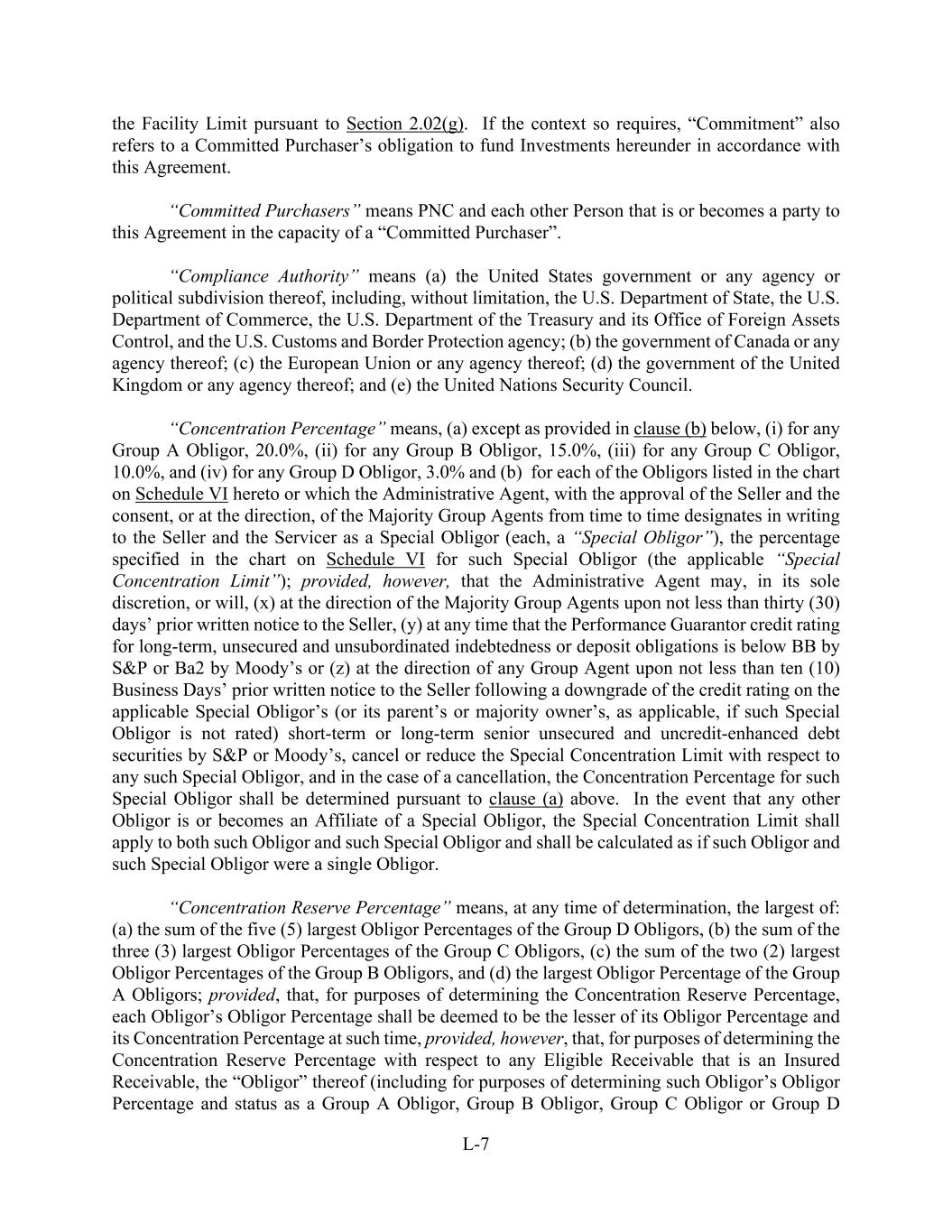 L-7根据第2.02(g)节规定的融资限额。如果上下文有此要求,“承诺”也是指承诺的买方根据本协议为本协议项下的投资提供资金的义务。“承诺购买者”是指PNC与作为或成为本协议一方的其他人以“承诺购买者”的身份。“合规管理局”是指(a)美国政府或其任何机构或政治分支机构,包括但不限于美国国务院、美国商务部、美国财政部及其外国资产管制办公室、美国海关和边境保护局;(b)加拿大政府或其任何机构;(c)欧盟或其任何机构;(d)英国政府或其任何机构;(e)联合国安全理事会。“集中百分比”是指,(a)除下文(b)条规定外,(i)任何A组义务人为20.0%,(ii)任何B组义务人为15.0%,(iii)任何C组义务人为10.0%,(iv)任何D组义务人为3.0%和(b)本协议附表VI图表所列的每一义务人或行政代理人经卖方批准并经多数集团代理人同意或在其指示下不时以书面形式指定卖方和服务商为特别义务人(每一项,a“特别义务人”),附表VI图表中为该特别义务人规定的百分比(适用的“特别集中限额”);但条件是,行政代理人可全权酌情或将(x)在提前不少于三十(30)天向卖方发出书面通知后按多数集团代理人的指示,(y)在任何时候将履约担保人的信用评级定为长期,在适用的特别义务人(或其母公司或大股东,如该特别义务人未获评级)的信用评级被下调后,无担保和非次级债务或存款义务低于标普规定的BB级或穆迪规定的Ba2级或(z)在任何集团代理的指示下,在向卖方发出不少于十(10)个工作日的书面通知后,向卖方发出不低于BB级或(z)级的特别义务人(或其母公司或大股东(如该特别义务人未获评级)的短期或长期高级无担保和无信用增强债务证券,取消或降低对任何该等特别义务人的特别集中限额,并且在取消的情况下,该特别义务人的集中百分比应根据上述(a)条确定。如任何其他义务人是或成为特别义务人的附属公司,则特别集中限额应同时适用于该义务人及该特别义务人,并应按该义务人及该特别义务人曾是单一义务人的方式计算。“集中储备百分比”是指,在任何确定时间,最大的是:(a)D组义务人的五(5)个最大义务人百分比的总和,(b)C组义务人的三(3)个最大义务人百分比的总和,(c)B组义务人的两(2)个最大义务人百分比的总和,以及(d)A组义务人的最大义务人百分比;但为确定集中储备百分比,每个债务人的债务人百分比应被视为其当时的债务人百分比和其集中百分比两者中的较低者,但前提是,为确定任何符合条件的应收款项(属于受保应收款)的集中储备百分比,其“债务人”(包括为确定该债务人的债务人百分比和作为A组债务人、B组债务人、C组债务人或D组的地位)