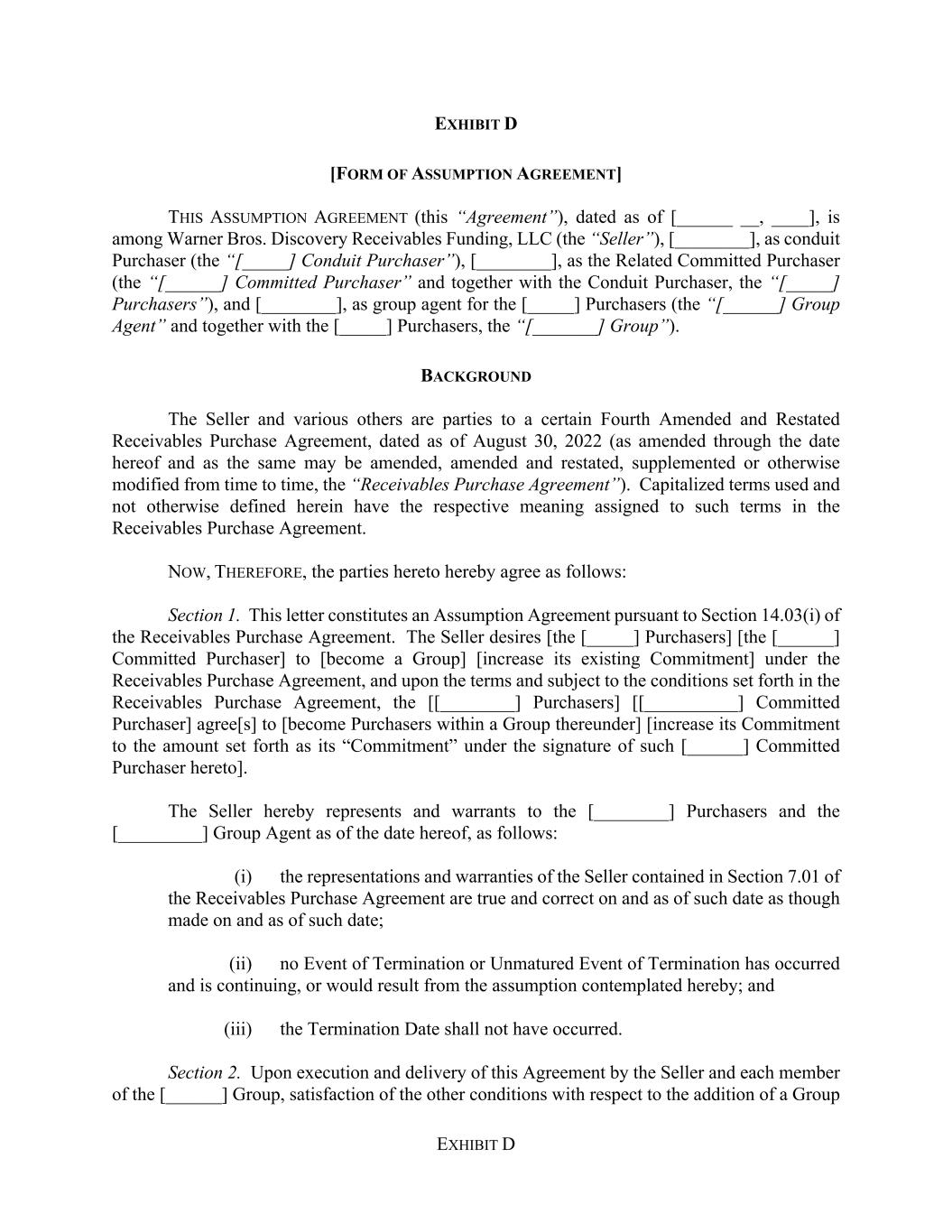 Exhibit d Exhibit d [ Form of Assumption Agreement ]本假设协议(本“协议”),日期为[ ________,_____ ],由Warner Bros. Discovery Receivables Funding,LLC(“卖方”)、[ ________ ]作为导管购买者(“[ _____ ]导管购买者”)、[ ________ ]作为相关承诺购买者(“[ ______ ]承诺购买者”,连同导管购买者,“[ ______ ]购买者”),以及[ ________ ]背景卖方和其他各类人是日期为2022年8月30日的某第四次经修订和重述的应收账款购买协议的当事人(经修订至本协议日期并可能不时修订、修订和重述、补充或以其他方式修改,称为“应收账款购买协议”)。此处使用和未另行定义的大写术语具有应收款购买协议中赋予此类术语的相应含义。现据此,双方在此约定如下:第一节。根据应收账款购买协议第14.03(i)节,本函构成假设协议。卖方希望[ [ ______ ]买方] [ [ ______ ]承诺买方] [成为集团] [增加其在应收款购买协议项下的现有承诺],并根据应收款购买协议中规定的条款和条件,[ [ __________ ]买方] [ [ __________ ]承诺买方]同意[在其项下成为集团内的买方] [增加其在该[ ______ ]承诺买方签署本协议项下作为其“承诺”所载金额的承诺]。卖方特此向截至本协议日期的[ _________ ]买方和[ _________ ]集团代理人陈述和保证如下:(i)应收款购买协议第7.01节所载卖方的陈述和保证在该日期和截至该日期是真实和正确的,如同在该日期和截至该日期作出的一样;(ii)没有发生终止事件或未成熟的终止事件,并且仍在继续,或将由本协议所设想的假设产生;(iii)终止日期不应发生。第2节。在卖方和[ ______ ]集团的每个成员签署并交付本协议时,满足与增加集团有关的其他条件