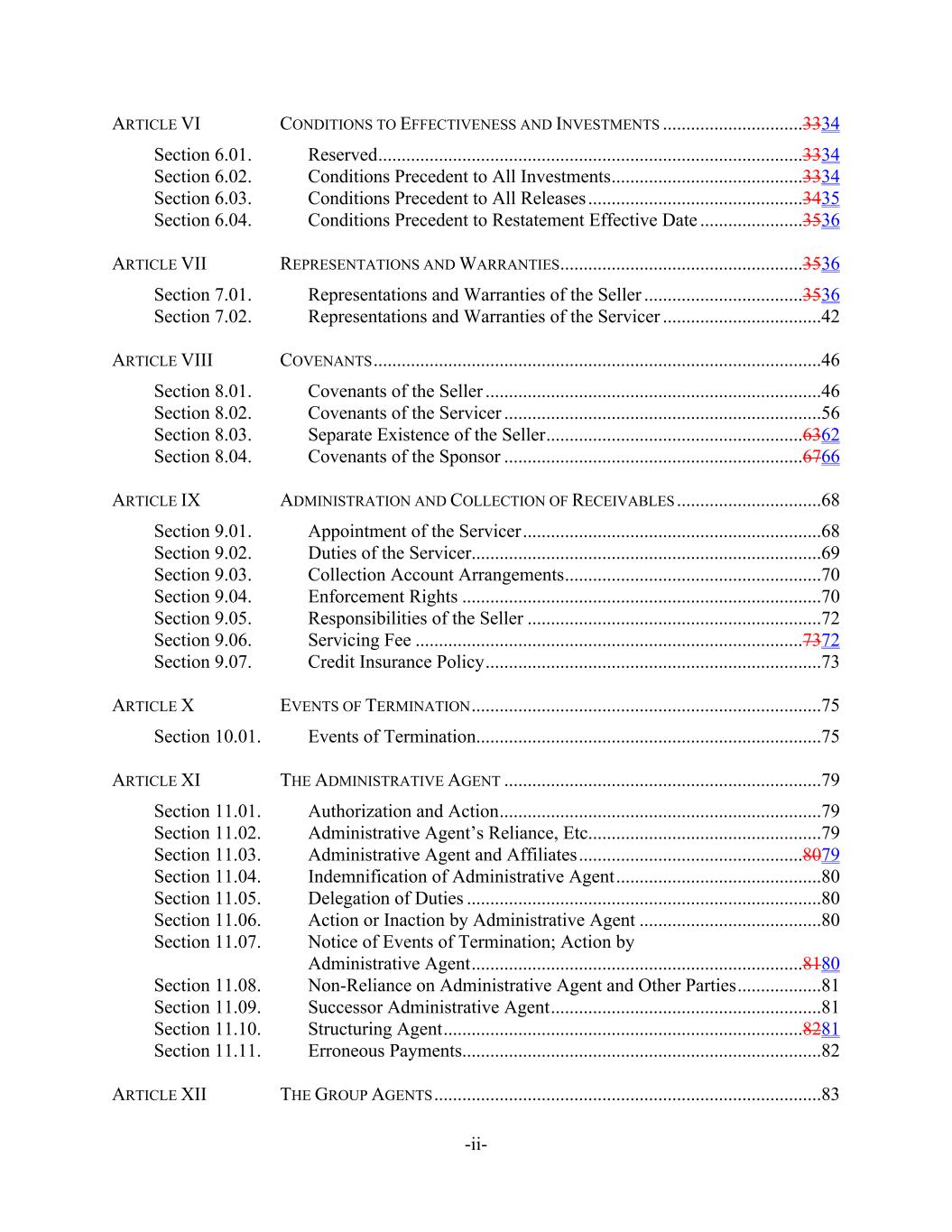 -第三条-第六条生效条件和投资......................................3334第6.01节。保留...................................................................................3 3334第6.02节。所有投资的先决条件.....................................................33 34第6.03节。所有释放的先决条件......................................................3435第6.04节。重述生效日期的先决条件....................3536第七条代表和授权....................................................3536第7.01节。卖方的陈述和保证..................................................3536第7.02节。服务人的陈述和保证..................................................42第八条盟约.......................................................................................46第8.01节。卖方的契诺......................................................................................46第8.02条。服务人的契诺....................................................................56第8.03条。卖方的单独存在...................................................................6362第8.04节。保荐机构的盟约...................................................................6766第九条管理和收取应收款项...................................68第9.01节。任命服务人员................................................................................68第9.02节。服务人的职责...................................................................................69第9.03节。收款账户安排.......................................................70第9.04节。强制执行权...................................................................................70第9.05节。卖方的责任.......................................................................72第9.06节。服务费...................................................................................7 372第9.07节。信用保险保单......................................................................73条十终止的事项...................................................................................75第10.01款。终止的事项..................................................................................75条XI行政代理人...................................................................................79第11.01节。授权和行动.....................................................................79第11.02节。行政代理人的依赖等..................................................79第11.03节。行政代理人及关联..................................................8079节第11.04节。行政代理人的赔偿....................................................80第11.05节。下放职责....................................................................................80第11.06节。行政代理人作为或不作为.......................................80第11.07节。终止事项通知;行政代理人行为.......................................................................8 180第11.08节。不依赖行政代理人和其他当事人..................81第11.09节。继任行政代理人..................................................................81第11.10节。构造剂.....................................................................8 281第11.11节。误付款项.....................................................................................82第十二条集团代理人...................................................................................83