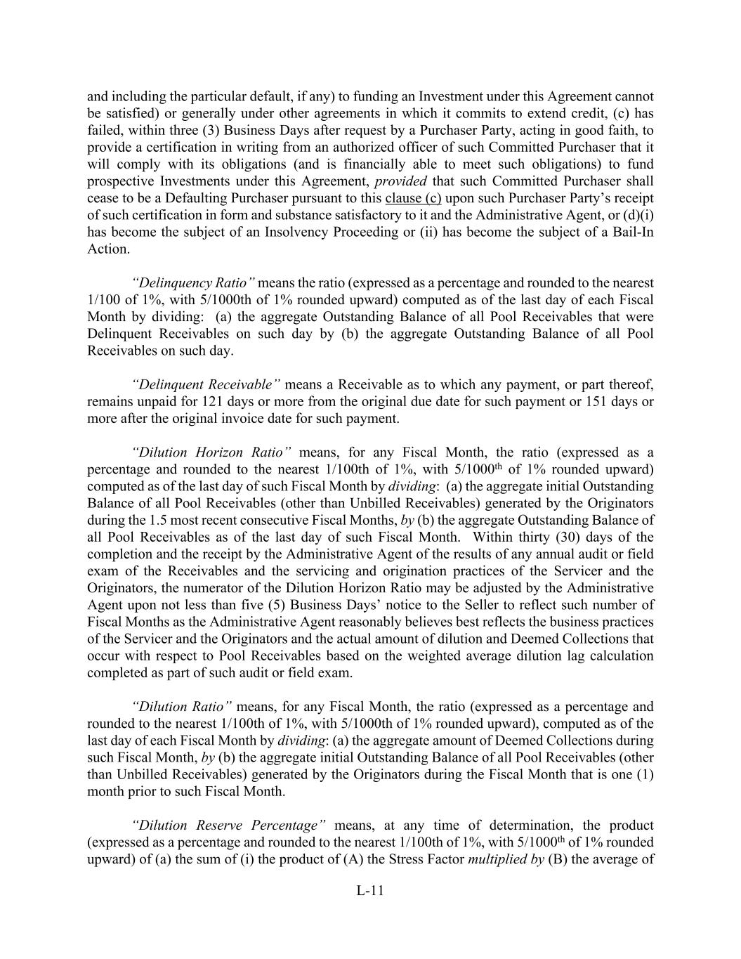 L-11和包括特定违约(如果有的话)无法满足根据本协议为投资提供资金)或一般根据其承诺提供信贷的其他协议,(c)未能在买方一方提出善意请求后的三(3)个工作日内提供该承诺买方的授权人员的书面证明,证明其将遵守其义务(并在财务上有能力履行此类义务)为本协议下的预期投资提供资金,但该承诺的买方在收到其和行政代理人满意的形式和实质证明后,或(d)(i)已成为破产程序的主体或(ii)已成为保释诉讼的主体,则根据本(c)条,该承诺的买方应不再是违约买方。“拖欠比率”是指截至每个财政月最后一天计算的比率(以百分比表示并四舍五入到最接近的1%的1/100,其中1%的5/1000向上四舍五入),方法是:(a)在该日属于拖欠应收款项的所有集合应收账款的未偿余额总额除以(b)该日所有集合应收账款的未偿余额总额。“拖欠应收款项”是指任何款项或其部分自该等款项的原始到期日起121天或以上或自该等款项的原始发票日期后151天或以上仍未支付的应收款项。“稀释地平线比率”是指,对于任何一个财政月,截至该财政月最后一天计算的比率(以百分比表示并四舍五入到1%的最接近的1/100,其中1%的5/1000向上四舍五入)除以:(a)发起人在最近连续1.5个财政月内产生的所有集合应收账款(未开票应收账款除外)的初始未偿余额总额,除以(b)截至该财政月最后一天的所有集合应收账款的未偿余额总额。在完成并由行政代理人收到任何应收账款年度审计或实地检查的结果以及服务商和发起人的服务和发起实践的三十(30)天内,稀释Horizon比率的分子可由行政代理人在向卖方发出不少于五(5)个工作日的通知后进行调整,以反映行政代理人合理地认为最能反映服务商和发起人的商业惯例的财政月数,以及基于作为此类审计或实地考试的一部分而完成的加权平均稀释滞后计算,就集合应收账款发生的稀释和视为收款的实际金额。“摊薄率”是指,对于任何一个财政月,截至每个财政月最后一天计算的比率(以百分比表示并四舍五入到1%的最接近的1/100,其中1%的5/1000向上四舍五入),方法是:(a)该财政月期间的视为收款总额,除以(b)发起人在该财政月之前的一(1)个月内产生的所有集合应收账款(未开票应收账款除外)的初始未偿余额总额。“稀释储备百分比”是指,在确定的任何时候,(a)(i)(a)的乘积乘以(a)压力因子的乘积乘以(b)的平均值的乘积(以百分比表示并四舍五入到1%的最接近的1/100,其中1%的5/1000向上四舍五入)的乘积(a)
