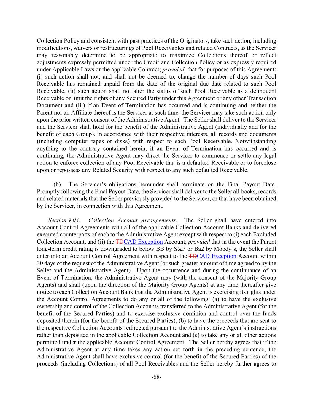 -68-催收政策并与发起人过去的做法一致,采取服务商可能合理地认为适当的行动,包括修改、放弃或重组集合应收账款和相关合同,以最大限度地提高其催收或反映信贷和催收政策明确允许的或适用法律或适用合同明确要求的调整;但就本协议而言:(i)此类行动不应也不应被视为,更改该集合应收款自与该集合应收款相关的原始到期日起仍未支付的天数,(ii)此类行动不得改变该集合应收款作为拖欠应收款的地位或限制任何有担保方在本协议或任何其他交易文件下的权利,以及(iii)如果终止事件已经发生且仍在继续,且其母公司或其关联公司当时均不是服务商,则服务商只能在行政代理人事先书面同意的情况下采取此类行动。卖方应向服务商交付,而服务商应按照各自的利益,为行政代理人的利益(单独或为各集团的利益)持有与每个池应收款项有关的所有记录和文件(包括计算机磁带或磁盘)。尽管有任何与此相反的规定,如果终止事件已经发生并且仍在继续,行政代理人可以指示服务商启动或解决任何法律诉讼,以强制收取属于违约应收款的任何集合应收款,或取消对任何此类违约应收款的任何相关担保的赎回权或收回其所有权。(b)服务商根据本协议承担的义务应在最后支付日期终止。在最终付款日期之后,服务商应立即向卖方交付卖方先前提供给服务商的或已由服务商获得的与本协议有关的所有账簿、记录和相关材料。第9.03节。收款账户安排。卖方应已与所有适用的收款账户银行订立账户控制协议,并将每一家的已执行对应方交付给行政代理人,但(i)每个除外收款账户和(ii)TDCAD例外账户除外;前提是,如果母公司的长期信用评级被标普下调至BB以下或被穆迪下调至Ba2,卖方应在行政代理人提出请求后30天内(或卖方与行政代理人约定的较长时间内)就TDAD异常账户订立账户控制协议。在终止事项发生时和继续期间,行政代理人可以(经多数集团代理人同意)并应(在多数集团代理人的指示下)在其后任何时间向各收款账户银行发出通知,表示该行政代理人正在行使其在账户控制协议下的权利,以进行以下任何或所有行为:(a)拥有转让给行政代理人的收款账户的专属所有权和控制权(为担保方的利益),并对存放在其中的资金行使专属所有权和控制权(为担保方的利益),(b)根据行政代理人的指示而不是存入适用的收款帐户而将送交有关收款帐户的收益重新定向,及(c)采取适用的帐户管制协议所准许的任何或所有其他行动。卖方在此同意,如行政代理人在任何时候采取前句所述的任何行动,则行政代理人对所有集合应收款的收益(包括收款)拥有专属控制权(为担保方的利益),卖方在此进一步同意