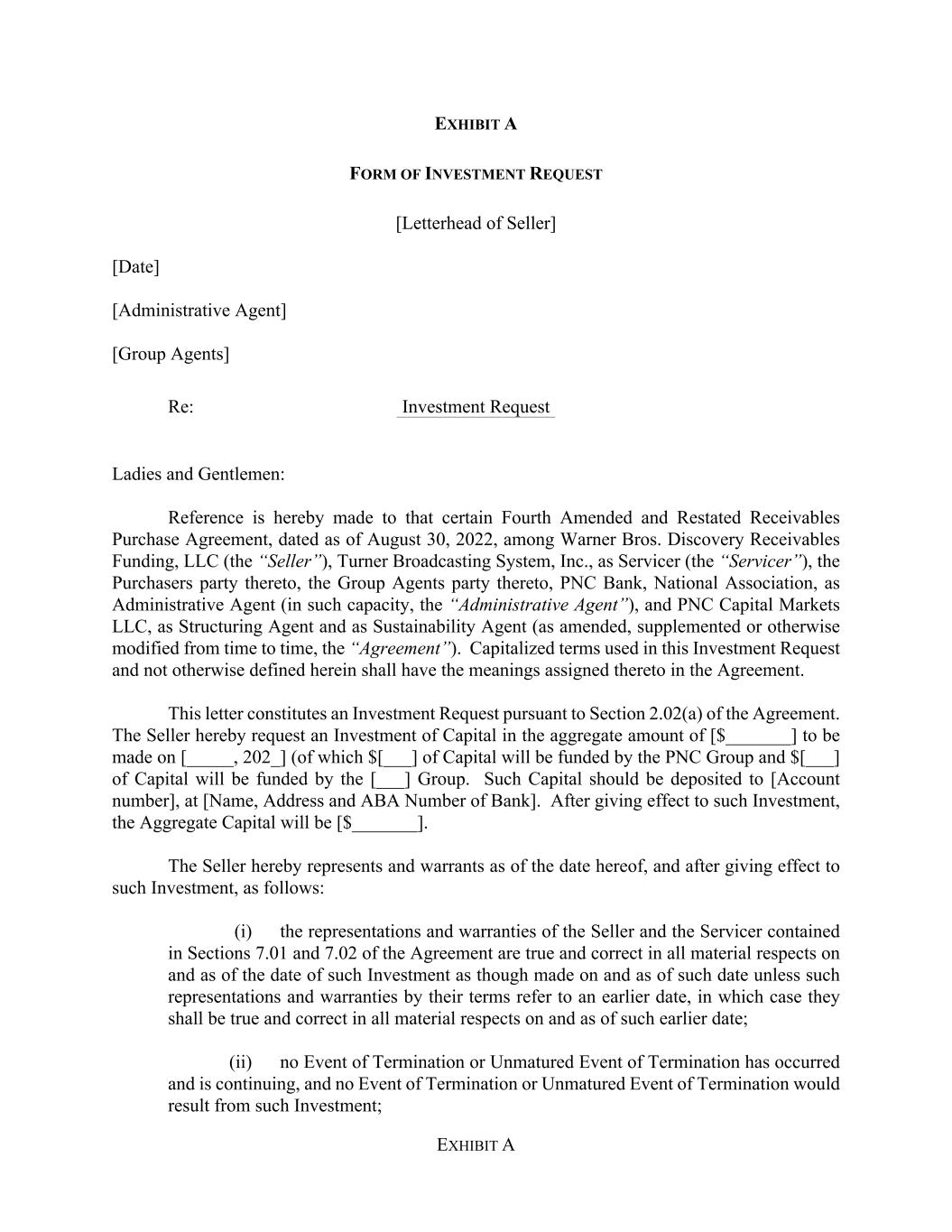 展览一份投资请求表[卖方信函] [日期] [行政代理人] [集团代理人] Re:Investment Request女士们先生们:兹提及Warner Bros. Discovery Receivables Funding,LLC(“卖方”)、Turner Broadcasting System,Inc.作为服务商(“服务商”)、买方一方、集团代理人一方、PNC银行、National Association作为行政代理人(在此身份下称为“行政代理人”)以及PNC Capital Markets LLC作为结构代理和可持续发展代理(经修订,不时补充或以其他方式修改,“协议”)。本投资请求中使用且未在此另行定义的大写术语应具有协议中赋予的含义。根据协议第2.02(a)节,本函构成投资请求。卖方特此请求于[ _____,202 _ ]进行总额为[ $ _______ ]的资本投资(其中$ [ ___ ]资本将由PNC集团提供资金,$ [ ___ ]资本将由[ ___ ]集团提供资金。此类资金应存入[账号]、[银行名称、地址和ABA号码]。该投资生效后,总资本将为[ $ ______ ]。卖方特此声明和保证截至本协议日期,并在该投资生效后,如下:(i)协议第7.01和7.02条所载的卖方和服务商的陈述和保证在该投资日期和截至该日期的所有重大方面都是真实和正确的,如同在该日期和截至该日期作出的一样,除非其条款中的此类陈述和保证是指较早的日期,在这种情况下,它们应在该较早日期和截至该日期的所有重大方面是真实和正确的;(ii)没有发生任何终止事件或未成熟的终止事件,并且正在继续,并且不会因该投资而导致任何终止事件或未成熟的终止事件;