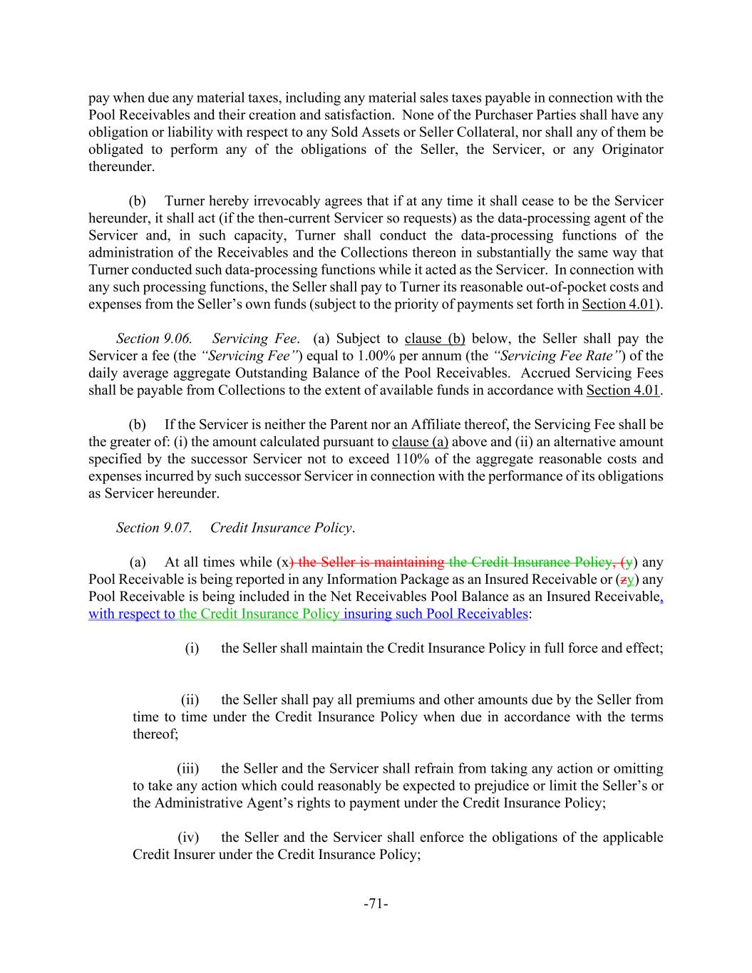 -71-在到期时支付任何材料税,包括与池应收账款及其创建和满足有关的任何材料销售税。买方各方均不对任何出售的资产或卖方抵押品承担任何义务或责任,也不对其中任何一方承担履行卖方、服务商或任何发起人在其项下的任何义务的义务。(b)特纳在此不可撤销地同意,如果在任何时候它不再是本协议项下的服务商,它应(如果当时的现任服务商这样要求)作为该服务商的数据处理代理人行事,并且在该身份下,特纳应以与特纳在担任服务商期间进行此类数据处理职能基本相同的方式进行应收款管理及其上的收款的数据处理职能。就任何此类处理功能而言,卖方应从卖方自有资金中向Turner支付其合理的自付费用和开支(以第4.01节规定的付款优先权为准)。第9.06节。服务费。(a)在符合以下(b)条的规定下,卖方须向服务商支付相当于池应收款项的每日平均未偿余额总额的每年1.00%(“服务费”)的费用(“服务费”)。应计服务费应根据第4.01节在可用资金范围内从收款中支付。(b)如服务人既非其父母,亦非其附属公司,则服务费须为以下两者中的较大者:(i)依据上文(a)条计算的款额及(ii)由继任服务人指明的替代款额,以不超过该继任服务人因履行其在本协议项下作为服务人的义务而招致的合理成本及开支总额的110%。第9.07节。信用保险单。(a)在(x)卖方维持信用保险单期间的任何时候,(y)任何集合应收账款在任何信息包中作为受保应收账款报告,或(zy)任何集合应收账款作为受保应收账款列入应收账款净额集合余额,关于为此类集合应收账款提供保险的信用保险单:(i)卖方应保持信用保险单完全有效;(ii)卖方应根据信用保险单的条款支付卖方根据信用保险单不时到期应付的所有保费和其他金额;(iii)卖方及服务商应避免采取任何可能合理预期会损害或限制卖方或行政代理人在信用保险单下的付款权利的行动或不采取任何行动;(iv)卖方和服务商应强制执行适用的信用保险人在信用保险单下的义务;
