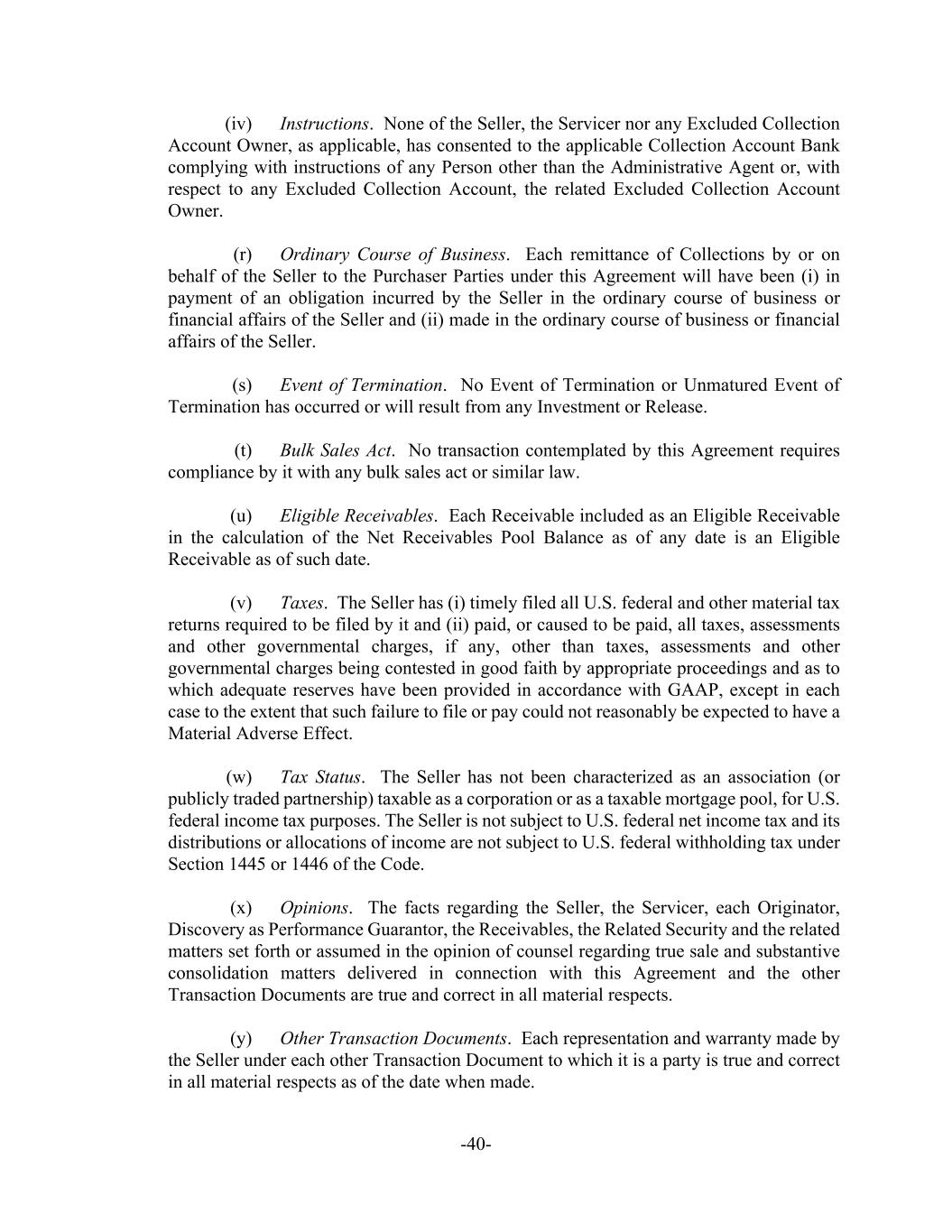 -40-(iv)说明。卖方、服务商或任何排除收款账户所有人(如适用)均未同意适用的收款账户银行遵守除行政代理人以外的任何人的指示,或就任何排除收款账户而言,相关的排除收款账户所有人的指示。(r)普通业务过程。卖方或代表卖方根据本协议向买方各方汇出的每笔收款将(i)用于支付卖方在卖方的正常业务或财务事务过程中产生的义务,以及(ii)在卖方的正常业务或财务事务过程中产生的义务。(s)终止事件。任何投资或解除均未发生或将导致任何终止或未成熟的终止事件。(t)《大宗销售法》。本协议所设想的任何交易均不要求其遵守任何大宗销售行为或类似法律。(u)符合条件的应收款。在计算截至任何日期的应收账款净额池余额时,作为合格应收账款列入的每项应收账款均为截至该日期的合格应收账款。(五)税收。卖方已(i)及时提交其要求提交的所有美国联邦和其他重要纳税申报表,以及(ii)已支付或促使支付所有税款、摊款和其他政府费用(如有),但通过适当程序善意质疑且已根据公认会计原则提供足够准备金的税款、摊款和其他政府费用除外,除非在每种情况下,不能合理地预期这种未提交或未支付会产生重大不利影响。(w)税务状况。就美国联邦所得税而言,卖方并未被定性为协会(或公开交易的合伙企业),应作为公司或应税抵押贷款池征税。卖方无需缴纳美国联邦净所得税,根据《守则》第1445或1446条,其分配或分配的收入无需缴纳美国联邦预扣税。(x)意见。有关卖方、服务商、各发起人、Discovery作为履约担保人、应收款、相关担保以及大律师认为就本协议和其他交易文件交付的真实销售和实质性合并事项所列或承担的相关事项的事实在所有重大方面都是真实和正确的。(y)其他交易文件。卖方根据其作为一方当事人的相互交易文件作出的每项陈述和保证在作出之日的所有重大方面都是真实和正确的。