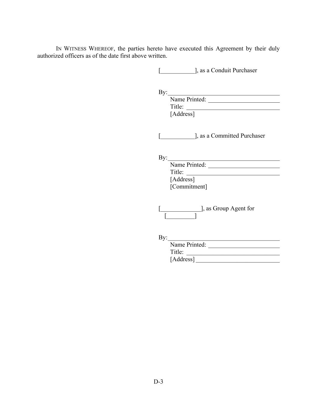 D-3作为证明,截至上述第一个书面日期,本协议双方已由其正式授权的官员签署本协议。[ ____________ ],作为导管购买者由:__________________________________________姓名印刷:______________________标题:______________________________________ [地址] [ __________ ],作为承诺购买者由:__________________________________________________________姓名印刷:______________