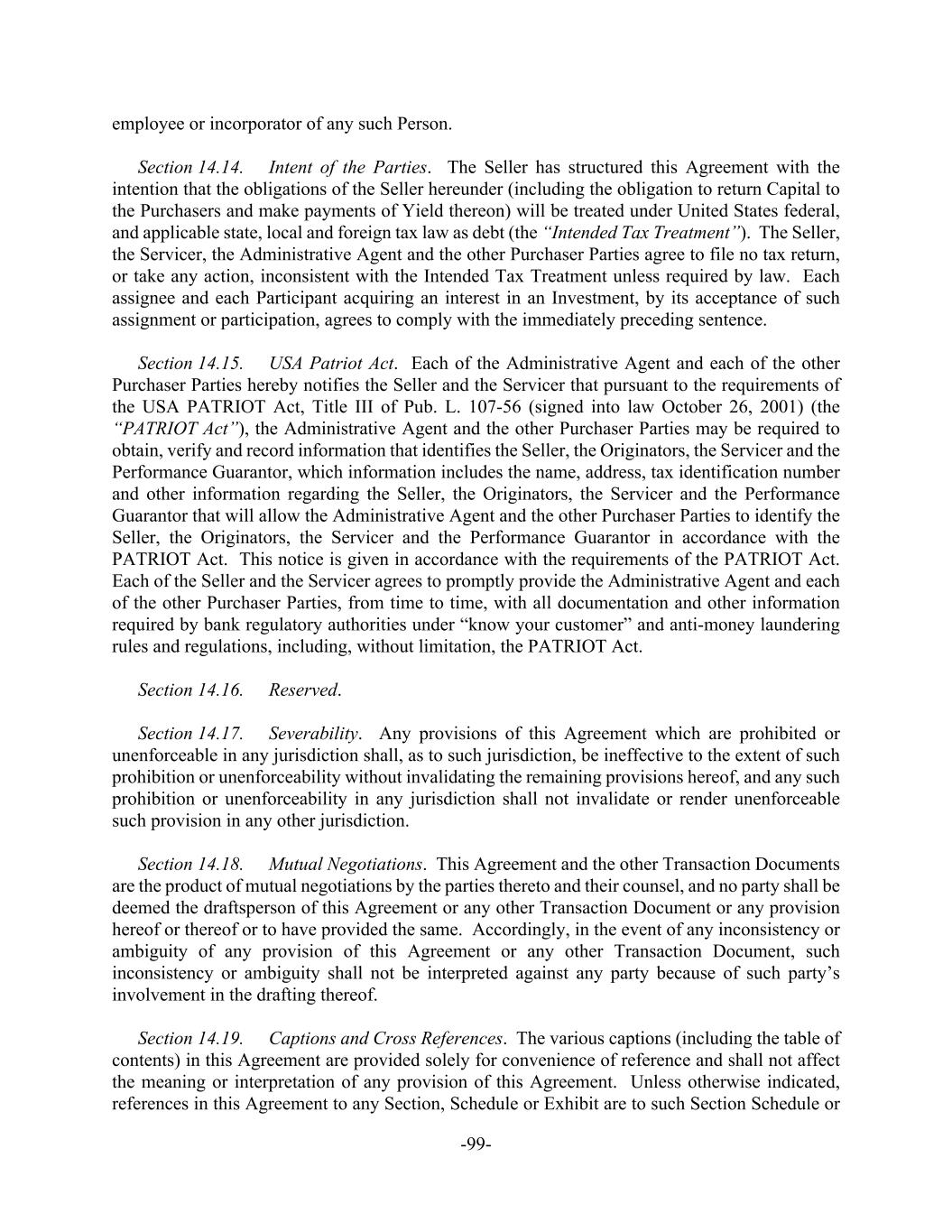 -99-任何该等人士的雇员或注册人。第14.14节。各方的意向。卖方构建本协议的意图是,根据美国联邦和适用的州、地方和外国税法,卖方在本协议项下的义务(包括向买方返还资本并支付收益的义务)将被视为债务(“预期税务处理”)。卖方、服务商、行政代理人及其他买方当事人同意不提交纳税申报表,或采取任何行动,与拟税务处理不一致,除非法律要求。每个受让人和获得投资权益的每个参与者,通过接受此类转让或参与,同意遵守前一句。第14.15节。美国爱国者法案。每一行政代理人和每一其他买方当事人特此通知卖方和服务商,根据《美国爱国者法案》的要求,Pub的Title III。L. 107-56(2001年10月26日签署成为法律)(“爱国者法案”),行政代理人和其他买方当事人可能被要求获得、核实和记录识别卖方、发起人、服务商和履约保证人的信息,这些信息包括名称、地址、税务识别号码和有关卖方、发起人、服务商和履约保证人的其他信息,这将允许行政代理人和其他买方当事人根据爱国者法案识别卖方、发起人、服务商和履约保证人。这份通知是根据《爱国者法案》的要求发出的。卖方和服务商各自同意,根据“了解您的客户”和反洗钱规则和条例,包括但不限于《爱国者法案》,及时向行政代理人和其他买方各方提供银行监管机构要求的所有文件和其他信息。第14.16节。保留。第14.17节。可分割性。本协议中任何在任何司法管辖区被禁止或不可执行的条款,就该司法管辖区而言,在不使本协议其余条款无效的情况下,在该禁止或不可执行的范围内无效,并且任何司法管辖区的任何此类禁止或不可执行不应使该条款在任何其他司法管辖区无效或无法执行。第14.18节。相互协商。本协议及其他交易文件均为协议各方及其律师相互协商的产物,任何一方均不得被视为本协议或任何其他交易文件或本协议或其任何条款的起草人或已提供相同内容。因此,在本协议或任何其他交易文件的任何条款出现任何不一致或不明确之处时,不应因为任何一方参与起草该协议或任何其他交易文件而对该不一致或不明确之处作出不利于任何一方的解释。第14.19节。标题和交叉引用。本协议中的各种标题(包括目录)仅为方便参考而提供,不影响本协议任何条款的含义或解释。除非另有说明,本协议中凡提述任何条文、附表或附件,均指该等条文的附表或