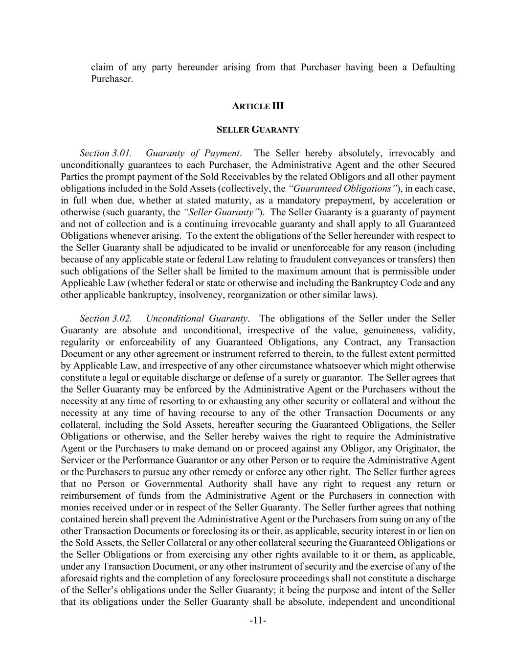-11-因该买方一直是违约买方而引起的本协议项下任何一方的索赔。第三条卖方担保第3.01款。付款保证。卖方在此绝对、不可撤销和无条件地向每一买方、行政代理人和其他有担保方保证相关义务人及时支付已售应收款项和包括在已售资产中的所有其他付款义务(统称“担保义务”),在每种情况下,在到期时全额支付,无论是在规定的到期日,作为强制性提前还款,通过加速或其他方式(此种担保,“卖方担保”)。卖方担保是付款担保而不是收款担保,是一种持续的不可撤销担保,无论何时发生,均应适用于所有被担保的义务。如果卖方根据本协议承担的与卖方担保有关的义务因任何原因(包括由于与欺诈性转让或转让有关的任何适用的州或联邦法律)被裁定为无效或不可执行,则卖方的此类义务应限于适用法律(无论联邦或州或其他,包括《破产法》和任何其他适用的破产、无力偿债、重组或其他类似法律)允许的最高金额。第3.02节。无条件担保。卖方担保项下的卖方义务是绝对和无条件的,无论任何担保义务、任何合同、任何交易文件或其中提及的任何其他协议或文书的价值、真实性、有效性、规律性或可执行性如何,在适用法律允许的最大范围内,也不考虑任何其他可能构成对担保人或担保人的合法或衡平法解除或抗辩的情况。卖方同意,卖方担保可由行政代理人或买方强制执行,无需在任何时候诉诸或用尽任何其他担保或担保物,也无需在任何时候诉诸任何其他交易单证或任何担保物,包括出售的资产,以保证此后的担保义务、卖方义务或其他方式,卖方在此放弃要求行政代理人或买方对任何义务人、任何发起人提出要求或进行诉讼的权利,服务人或履约保证人或任何其他人或要求行政代理人或买方寻求任何其他补救或强制执行任何其他权利。卖方进一步同意,任何人或政府当局均无权要求行政代理人或买方就根据卖方担保收到的款项或就卖方担保收到的款项进行任何返还或偿还资金。卖方进一步同意,本协议所载的任何内容均不得阻止行政代理人或买方就任何其他交易文件提起诉讼或酌情取消其在出售资产、卖方担保物或任何其他担保物上的担保权益或留置权,或根据任何交易文件行使其或他们(如适用)可利用的任何其他权利,或任何其他担保文书以及行使上述任何权利和完成任何止赎程序均不构成卖方在卖方担保项下的义务的解除;卖方的目的和意图是其在卖方担保项下的义务应是绝对、独立和无条件的