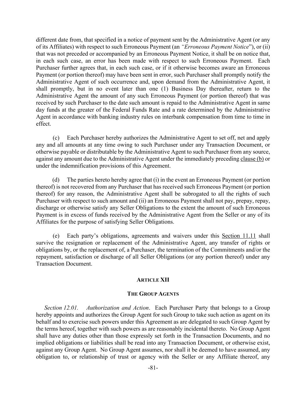 -81-行政代理人(或其任何关联公司)就该等错误付款发出的付款通知(“错误付款通知”)中指明的日期,或(ii)未在错误付款通知之前或随附的日期,应在收到通知后,在每一此种情况下,已就该等错误付款作出错误。各买方还同意,在每一此种情况下,或如其以其他方式知悉可能已错误发送错误付款(或其部分),该买方应将此种情况迅速通知行政代理人,并应行政代理人的要求,迅速但在不迟于其后一(1)个工作日的情况下,将该买方收到的任何此类错误付款(或其部分)的金额按联邦基金利率和行政代理人根据不时生效的银行业同业代偿规则确定的利率中的较大者退还给行政代理人,直至该金额在当天资金中偿还给行政代理人之日。(c)各买方特此授权行政代理人根据任何交易文件,或以其他方式由行政代理人从任何来源应付或分配给该买方的任何款项,抵销、净额及在任何时间适用该行政代理人根据紧接前一条款(b)项或根据本协议的赔偿条款应付该行政代理人的任何款项。(d)双方在此同意,(i)如因任何理由未能向已收到该错误付款(或其部分)的任何买方追回错误付款(或其部分),则行政代理人须代位行使该买方就该款项的所有权利,及(ii)错误付款不得支付、预付、偿还,解除或以其他方式履行任何卖方义务,只要此类错误付款的金额超过行政代理人为履行卖方义务而从卖方或其任何关联公司收到的资金。(e)每一方根据本条第11.11款承担的义务、协议和放弃应在行政代理人辞职或更换、买方转让权利或义务或更换买方、终止承诺和/或根据任何交易文件偿还、清偿或解除所有卖方义务(或其任何部分)后继续有效。第十二条集团代理人第12.01款。授权和行动。属于集团的每一买方方特此指定并授权该集团的集团代理人代表其作为代理人采取行动,并根据本协议行使本协议条款授予该集团代理人的权力,以及合理附带的权力。除交易文件中明确规定的义务外,任何集团代理人不得承担任何义务,不得将任何默示义务或责任解读为任何交易文件,或以其他方式存在针对任何集团代理人的义务或责任。任何集团代理人均不承担,也不应被视为已承担对卖方或其任何关联公司的任何义务,或与其之间的信托或代理关系,任何