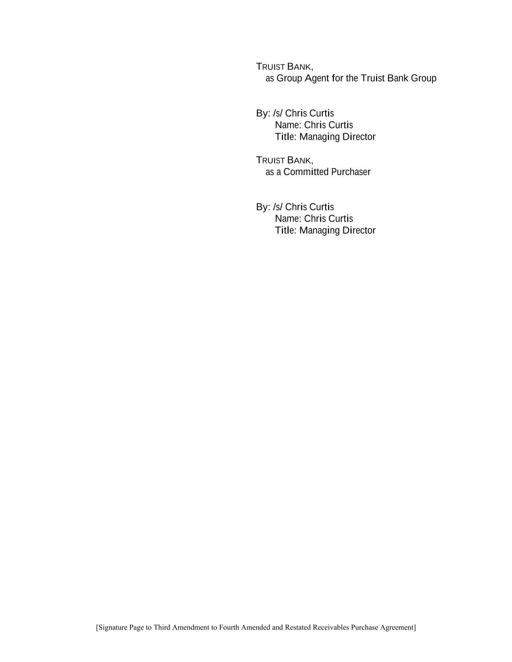 【第四次修订和重述的应收账款购买协议第三次修订的签署页】TRUIST BANK,作为Truist Bank Group的集团代理由:/s/Chris Curtis姓名:Chris Curtis职务:董事总经理TRUIST BANK,作为承诺购买者由:/s/Chris Curtis姓名:Chris Curtis职务:董事总经理