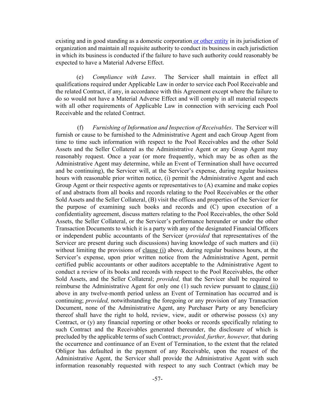 -57-在其组织管辖范围内作为国内公司或其他实体存在并具有良好信誉,并在可以合理预期未能拥有此类权力会产生重大不利影响的情况下,维持在其开展业务的每个管辖范围内开展业务的所有必要权力。(e)遵守法律。服务商应保持有效的适用法律要求的所有资格,以便按照本协议为每一池应收账款和相关合同(如有)提供服务,除非未能这样做不会产生重大不利影响,并且将在所有重大方面遵守适用法律与为每一池应收账款和相关合同提供服务有关的所有其他要求。(f)提供资料和检查应收款。服务商将作为行政代理人或任何集团代理人可能合理要求的,不时向行政代理人和每个集团代理人提供或促使提供有关集合应收款和其他出售资产以及卖方抵押品的信息。每年一次(或更频繁地,可能是行政代理人可能确定的频率),而终止事件应当已经发生并仍在继续),服务人将在正常营业时间内(由服务人承担费用并合理事先书面通知,(i)允许行政代理人和每个集团代理人或其各自的代理人或代表(a)审查和制作与集合应收款或其他出售资产和卖方抵押品有关的所有账簿和记录的副本和摘要,(b)访问服务商的办公室和物业,以检查该等簿册和记录,以及(c)在签署保密协议时,与服务商的任何指定财务人员或独立公共会计师(但该服务商的代表在该等讨论期间在场)在知悉该等事项的情况下,讨论与集合应收款、其他出售资产、卖方抵押品或服务商根据本协议或其作为一方的其他交易文件的履行有关的事项,以及(ii)不限制上文第(i)款的规定,在正常营业时间内,经行政代理人事先书面通知,允许注册会计师或行政代理人可接受的其他审计师对其关于集合应收账款、其他已售资产和卖方抵押品的账簿和记录进行审查,费用由服务商承担;但须要求服务商在任何十二个月期间仅根据上文第(ii)款向行政代理人偿还一(1)项此类审查,除非终止事件已经发生且仍在继续;但尽管有上述规定或任何交易文件的任何规定,行政代理人、任何买方一方或其任何受益人均无权持有、审查、查看、审计或以其他方式拥有(x)任何合同,或(y)任何财务报告或其他账簿或记录,具体涉及该合同及其项下产生的应收款项,但该合同的适用条款不排除披露这些账簿或记录;但进一步规定,在终止事件发生和持续期间,在相关债务人未按行政代理人的请求支付任何应收款项的情况下,服务商应就任何此类合同向行政代理人提供合理要求的此类信息(可能是