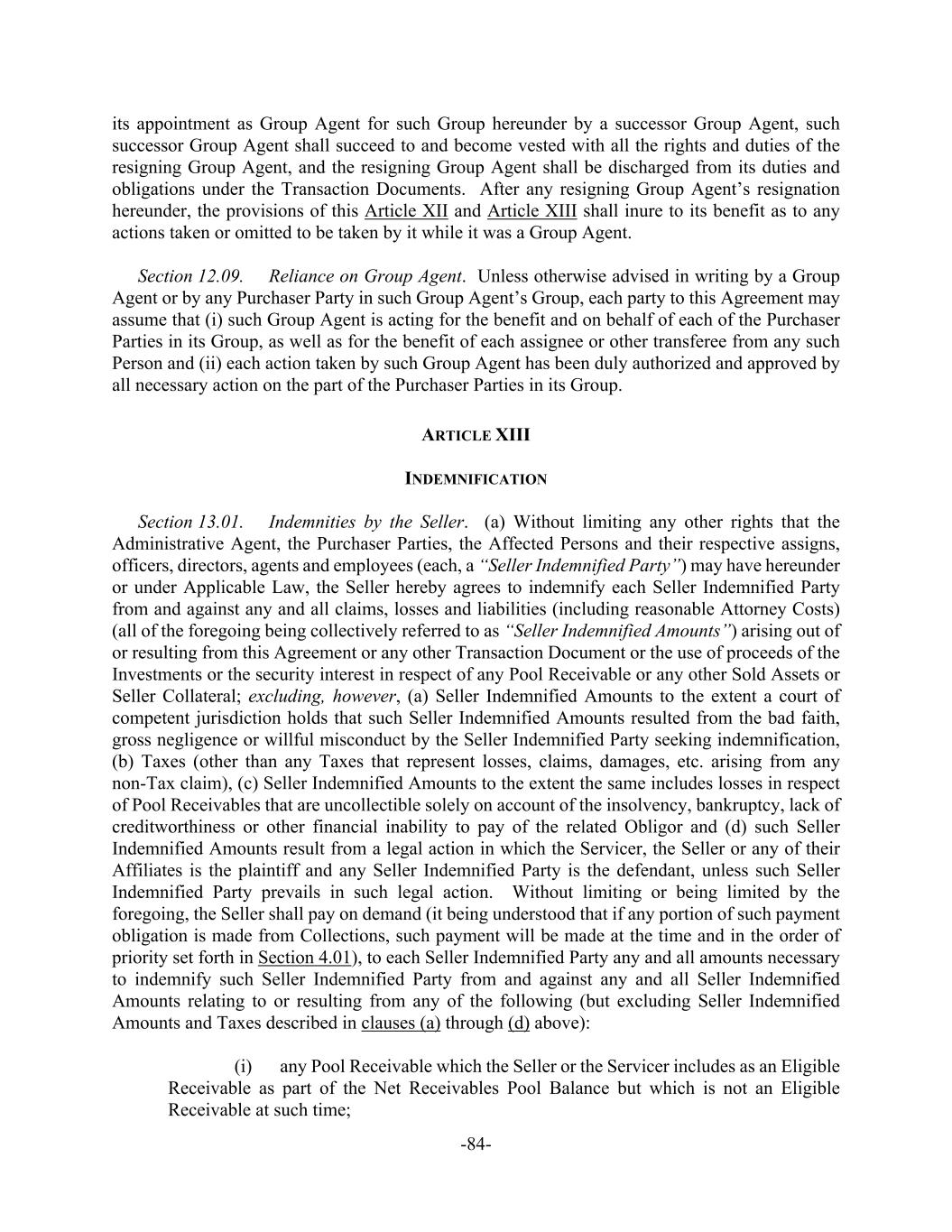 -84-其由继任集团代理人委任为本协议项下该集团的集团代理人,该继任集团代理人应继承并归属于辞职集团代理人的所有权利和义务,辞职集团代理人应被解除其在交易文件项下的职责和义务。任何辞职的集团代理人在本协议项下离职后,其在担任集团代理人期间采取或不采取的任何行动,依照本条第十二条和第十三条的规定,对其有利。第12.09节。依赖集团代理。除非集团代理人或该集团代理人集团内的任何买方另有书面告知,否则本协议的每一方均可假定(i)该集团代理人是为其集团内每一买方当事人的利益和代表其集团内每一买方当事人的利益行事,以及为任何该等人的每一受让人或其他受让人的利益行事,以及(ii)该集团代理人采取的每一项行动均已获得其集团内买方当事人采取的所有必要行动的正式授权和批准。第十三条赔偿第13.01节。卖方的赔偿。(a)在不限制行政代理人、买方各方、受影响人士及其各自的受让人、高级职员、董事、代理人和雇员(各自称为“卖方受偿方”)根据本协议或根据适用法律可能拥有的任何其他权利的情况下,卖方在此同意就任何和所有索赔对每一卖方受偿方进行赔偿,因本协议或任何其他交易文件或使用投资收益或任何集合应收账款或任何其他已售资产或卖方抵押品的担保权益而产生或导致的损失和责任(包括合理的律师费)(所有上述情况统称为“卖方赔偿金额”);但不包括(a)卖方赔偿金额,前提是有管辖权的法院认为此类卖方赔偿金额是由寻求赔偿的卖方受赔偿方的恶意、重大过失或故意不当行为导致的,(b)税款(代表任何非税务索赔产生的损失、索赔、损害等的任何税款除外),(c)卖方赔偿金额,但同一金额包括仅因相关债务人无力偿债、破产、缺乏信誉或其他财务无力支付而无法收回的集合应收账款的损失,以及(d)此类卖方赔偿金额是由服务商、卖方或其任何关联公司为原告且任何卖方受赔偿方为被告的法律诉讼产生的,除非该卖方受赔偿方在该法律诉讼中胜诉。在不受前述限制或限制的情况下,卖方应按要求付款(有一项理解,如果此类付款义务的任何部分是从托收中支付的,则将在时间上按第4.01节规定的优先顺序支付此类款项),向每一卖方受偿方提供任何和所有必要的金额,以向该卖方受偿方赔偿与以下任何一项有关或由此产生的任何和所有卖方受偿额(但不包括上文(a)至(d)条所述的卖方受偿额和税款):(i)卖方或服务商将其列为合格应收款的任何集合应收款,作为应收账款净余额的一部分,但此时不属于合格应收款;