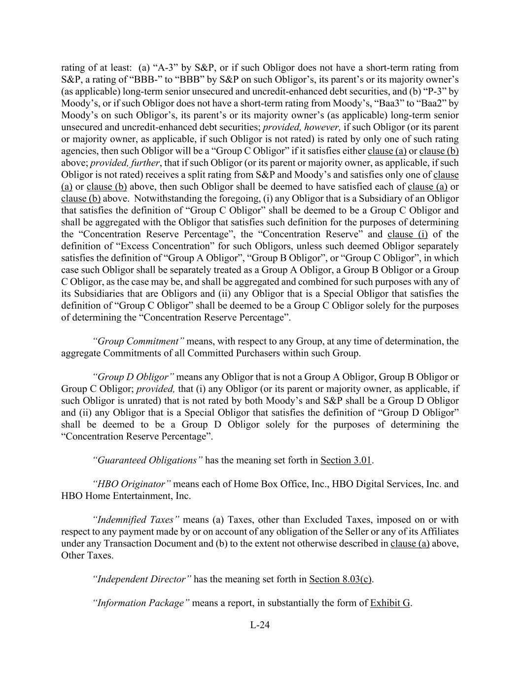 L-24评级至少:(a)标普的“A-3”评级,或者如果该债务人没有标普的短期评级,则标普对该债务人、其母公司或其大股东(如适用)的长期优先无担保和无信用增强债务证券的评级为“BBB-”至“BBB”,以及(b)穆迪的“P-3”评级,或者如果该债务人没有穆迪的短期评级,则该债务人、其母公司或其大股东(如适用)的长期优先无担保和无信用增强债务证券的“Baa3”至“Baa2”评级;但前提是,如果该债务人(或其母公司或大股东,(如适用),如果该债务人未被评级)仅由该等评级机构中的一家评级,则该债务人在满足上述(a)或(b)条中任何一条的情况下将成为“C组债务人”;此外,如果该债务人(或其母公司或大股东,如适用,该债务人未被评级)获得标普和穆迪的拆分评级,并且仅满足上述(a)或(b)条中的一项,则该债务人应被视为已满足上述(a)或(b)条中的每一条。尽管有上述规定,(i)作为满足“丙组义务人”定义的义务人的附属公司的任何义务人,应被视为丙组义务人,并应与满足该定义的义务人合并,以确定该等义务人的“集中储备百分比”、“集中储备”和“超额集中”定义的(i)条,除非该被视为义务人分别满足“A组义务人”、“B组义务人”或“C组义务人”的定义,在此情况下,该义务人应被单独视为A组义务人,a B组义务人或C组义务人(视属何情况而定),并须为该等目的而与其任何属义务人的附属公司合并及合并;及(ii)任何属特别义务人且符合「 C组义务人」定义的义务人,仅为厘定「集中储备百分比」的目的,须视为C组义务人。“集团承诺”是指,就任何集团而言,在确定的任何时间,该集团内所有承诺购买者的总承诺。“D组义务人”是指不属于A组义务人、B组义务人或C组义务人的任何义务人;但前提是,(i)任何未获得穆迪和标普双方评级的义务人(或其母公司或大股东,如该义务人未获评级)应为D组义务人,以及(ii)任何属于满足“D组义务人”定义的特别义务人的任何义务人,仅为确定“集中储备百分比”的目的,应被视为D组义务人。“担保义务”具有第3.01节规定的含义。“HBO Originator”是指Home Box Office,Inc.、HBO Digital Services,Inc.和HBO Home Entertainment,Inc.各自。“弥补税”是指(a)对卖方或其任何关联公司根据任何交易文件承担的任何义务或因其任何义务而支付的任何款项征收或与之相关的税项(不包括税项),以及(b)在上文(a)条未另有说明的范围内,其他税项。“独立董事”具有第8.03(c)节规定的含义。“信息包”是指一份报告,其基本形式为附件 G。