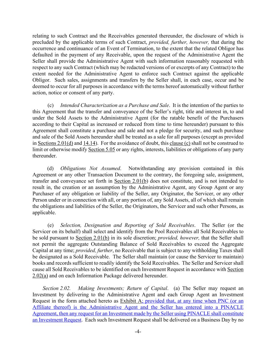 -4-与该合同及其项下产生的应收款项有关,但该合同的适用条款不允许披露,但进一步规定,在终止事件发生和持续期间,只要相关债务人拖欠任何应收款项的付款,应行政代理人的请求,卖方应向行政代理人提供就任何此类合同(可能是任何合同的编辑版本或节选)合理要求的信息,以供行政代理人对适用的义务人执行此类合同所需。卖方的此类出售、转让和转让,在每种情况下均应发生,并根据本协议的条款自动被视为发生,而无需任何一方采取进一步行动、通知或同意。(c)拟定性为购买和销售。本协议各方的意图是,根据本协议将卖方在出售资产上的权利、所有权和权益、对出售资产的所有权和权益以及在出售资产下的权益转让和转让给行政代理人(为买方根据其在本协议项下不时增加或减少的资本的应课税利益),应构成买卖,而不是担保质押,并且根据本协议项下出售资产的此类购买和出售应被视为所有目的的出售(第2.01(d)和14.14条规定的除外)。为免生疑问,本(c)条不得解释为限制或以其他方式修改第5.05条或任何一方在该条下的任何权利、利益、责任或义务。(d)未承担的义务。尽管本协议或任何其他交易文件中有任何相反的规定,第2.01(b)节中规定的上述出售、转让、转让和转让并不构成,也无意导致行政代理人、任何集团代理人或任何买方设定或承担卖方、任何发起人、服务商或任何其他人在任何已售资产项下或与其全部或任何部分相关的任何义务或责任,所有这些义务和责任仍应是卖方、发起人的义务和责任,服务人及适用的其他人士。(e)选定、指定和报告已售应收款。卖方(或代其服务的人)应自行决定从集合应收账款中选择和识别根据第2.01(b)节出售的所有已售应收账款;但条件是,卖方不得允许已售应收账款的未偿余额总额在任何时候超过总资本;此外,须缴纳任何预扣税的任何应收账款均不得指定为已售应收账款。卖方应保持(或促使服务商保持)足以随时识别已售应收款项的账簿和记录。卖方和服务商应促使根据第2.02(a)节在每项投资请求上以及在根据本协议交付的每个信息包上识别所有已售应收账款。第2.02节。进行投资;返还资本。(a)卖方可以通过向行政代理人和每个集团代理人交付一份投资请求书的方式提出投资请求书,该投资请求书的格式如本协议所附,作为附件 A;但在任何时候当PNC(或其关联公司)作为行政代理人且卖方已订立PINACLE协议时,则卖方使用PINACLE提出的任何投资请求均应构成投资请求书。每份该等投资申请须于一个营业日由no