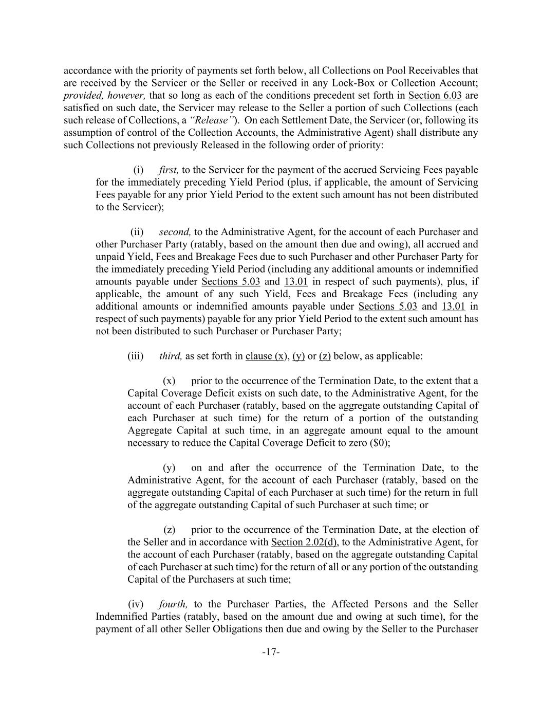 -17-根据下文规定的付款优先权,由服务商或卖方收到或在任何Lock-Box或收款账户中收到的所有集合应收款收款;但条件是,只要在该日期满足第6.03节中规定的每一项先决条件,服务商就可以向卖方释放此类收款的一部分(每一此种收款释放,“释放”)。在每个结算日,服务商(或,在其取得对收款账户的控制权后,行政代理人)应按以下优先顺序分配任何先前未发放的此类收款:(i)首先,向服务商支付紧接前一个收益期应支付的应计服务费(如适用,则加上任何前一个收益期应支付的服务费金额,前提是该金额尚未分配给服务商);(ii)其次,向行政代理人,为每个买方和其他买方一方的账户(按比例,基于当时到期和欠款的金额)、该买方和其他买方在紧接的上一个收益期内应支付的所有应计和未支付的收益率、费用和破碎费(包括根据第5.03和13.01条就该等付款应付的任何额外金额或弥偿金额),加上(如适用)任何该等收益率的金额,费用和破碎费(包括根据第5.03和13.01条就此类付款应支付的任何额外金额或弥偿金额)在任何先前收益期间支付,但该金额未分配给该买方或买方一方;(iii)第三,如下文(x)、(y)或(z)条(视情况而定)所述:(x)在终止日期发生之前,在该日期存在资本覆盖赤字的情况下,向行政代理人,为每个买方的账户(按比例,基于每个买方当时的未偿资本总额),用于返还当时未偿总资本的一部分,总金额等于将资本覆盖赤字减至零(0美元)所需的金额;(y)在终止日期发生之日及之后,向行政代理人,为每个买方的账户(按比例,基于每个买方在该时间的未偿还资本总额)以全额返还该买方在该时间的未偿还资本总额;或(z)在终止日期发生之前,由卖方选择并根据第2.02(d)节,向行政代理人,为每个买方的账户(按比例,基于每个买方在该时间的未偿还资本总额)返还买方在该时间的全部或任何部分未偿还资本;(iv)第四,向买方各方,受影响人士和卖方获弥偿方(按比例,基于当时到期和欠款的金额),以支付卖方当时到期和欠买方的所有其他卖方义务
