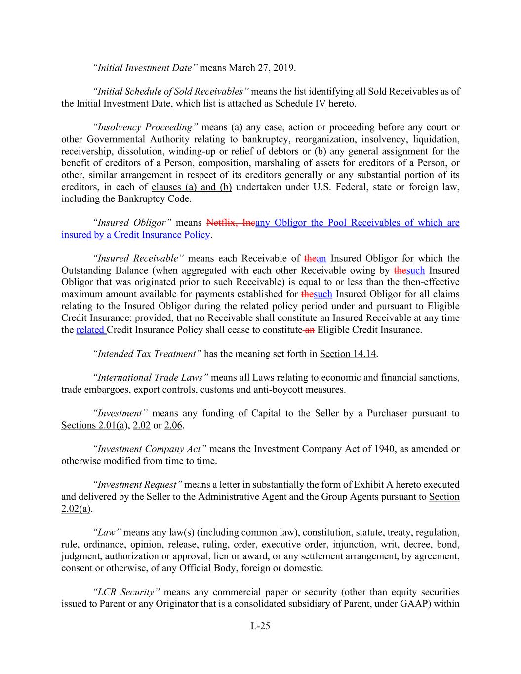 L-25“初始投资日期”是指2019年3月27日。“已售应收款项初始明细表”是指识别截至初始投资日的所有已售应收款项的清单,该清单作为附表IV附于本文件后。“破产程序”是指(a)在任何法院或其他政府当局审理的与债务人的破产、重组、无力偿债、清算、接管、解散、清盘或救济有关的任何案件、诉讼或程序,或(b)根据美国联邦、州或外国法律(包括《破产法》)中的每一条款(a)和(b)中为某人的债权人的利益而进行的任何一般性转让、组成、为某人的债权人编组资产或其他与其债权人一般或其任何实质性部分债权人有关的类似安排。“Insured Obligor”是指Netflix,Incany Obligor,其集合应收账款由信用保险单承保。“应收保额”是指某一被保义务人的每一笔应收款项,其未偿余额(当与在该应收款项之前产生的该被保义务人所欠的其他应收款项相互合计时)等于或小于根据合格信用保险在相关保单期间内就与被保义务人有关的所有索赔为该被保义务人确定的当时有效的可用于付款的最高金额;但任何应收款项在任何时候均不构成应收保额,相关信用保险单不再构成合格信用保险。“拟税务处理”具有第14.14节规定的含义。“国际贸易法”是指与经济和金融制裁、贸易禁运、出口管制、海关和反抵制措施有关的所有法律。“投资”是指买方根据第2.01(a)、2.02或2.06条向卖方提供的任何资金。“投资公司法”是指经不时修订或以其他方式修订的1940年《投资公司法》。“投资请求”是指卖方根据第2.02(a)节签署并交付给行政代理人和集团代理人的基本上以附件 A形式存在的信函。“法律”是指任何外国或国内官方机构通过协议、同意或其他方式制定的任何法律(包括普通法)、宪法、法规、条约、条例、规则、条例、意见、释放、裁决、命令、行政命令、强制令、令状、法令、债券、判决、授权或批准、留置权或裁决,或任何和解安排。“LCR证券”是指任何商业票据或证券(根据公认会计原则向母公司或作为母公司合并子公司的任何发起人发行的股本证券除外)在