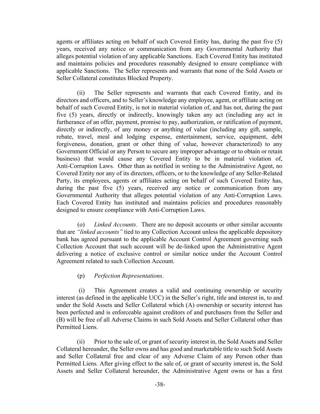 -38-在过去五(5)年中,代表此类涵盖实体行事的代理人或关联机构收到了来自任何政府当局的任何通知或通信,声称可能违反了任何适用的制裁。每个涵盖的实体都制定并维持合理设计的政策和程序,以确保遵守适用的制裁。卖方声明并保证,出售的资产或卖方抵押品均不构成封锁财产。(ii)卖方声明并保证,每个涵盖实体及其董事和高级职员,并据卖方所知,代表该涵盖实体行事的任何雇员、代理人或关联公司没有重大违反,并且在过去五(5)年内,没有直接或间接明知而采取任何行为(包括直接或间接促进任何金钱或任何有价值的东西(包括任何礼物、样品、回扣、旅行、餐饮和住宿费用、娱乐、服务、设备、债务免除、捐赠,授予或其他有价值的东西,无论其特征如何)给任何政府官员或任何人,以获取任何不正当利益或获得或保留业务)这将导致任何涵盖的实体严重违反,反腐败法。除以书面形式通知行政代理人外,任何涵盖实体或其任何董事、高级职员,或据任何卖方关联方、其雇员、代理人或代表该涵盖实体行事的关联公司所知,均未在过去五(5)年内收到来自任何政府当局的任何通知或来文,声称可能违反任何反腐败法。每个涵盖的实体都制定并维护了合理设计的政策和程序,以确保遵守反腐败法律。(o)关联账户。不存在与任何收款账户绑定的存款账户或其他类似账户属于“关联账户”的情况,除非适用的存款银行已根据管辖该收款账户的适用账户控制协议约定,一旦行政代理人根据账户控制协议送达与该收款账户相关的专属控制通知或类似通知,该账户将解除关联。(p)完美表示。(i)本协议在卖方对出售资产和卖方担保物的权利、所有权和权益、对出售资产和卖方担保物的所有权和权益以及在出售资产和卖方担保物项下的权利、所有权和权益中创建有效且持续的所有权或担保权益(定义见适用的UCC),其中(a)所有权或担保权益已完善,可针对卖方的债权人和购买人强制执行,以及(b)将不存在对此类出售资产和卖方担保物的除许可留置权之外的所有不利债权。(ii)在出售或授予本协议项下的已售资产和卖方抵押品的担保权益之前,卖方拥有并拥有此类已售资产和卖方抵押品的良好和可销售的所有权,不存在任何人的任何不利债权,但允许的留置权除外。在本协议项下出售已出售资产和卖方担保物或授予其担保权益生效后,行政代理人拥有或拥有第