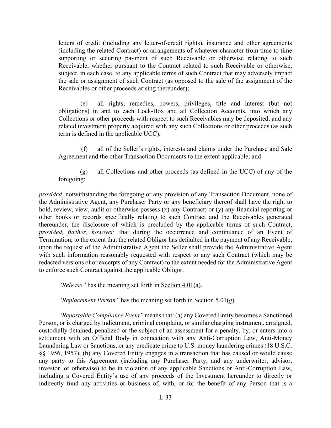 L-33信用证(包括任何信用证权利)、保险和其他协议(包括相关合同)或不时支持或确保支付此类应收款或以其他方式与此类应收款有关的任何性质的安排,无论是根据与此类应收款有关的合同还是其他方式,在每种情况下均受可能对此类合同的出售或转让产生不利影响的此类合同的任何适用条款的约束(而不是出售应收款的转让或由此产生的其他收益);(e)所有权利、补救办法、权力、特权,每个Lock-Box和所有收款账户中的所有权和利息(但不包括义务),与此类应收款有关的任何收款或其他收益可存入该账户,以及以任何此类收款或其他收益(该术语在适用的UCC中定义)获得的任何相关投资财产;(f)卖方在适用的范围内根据买卖协议和其他交易文件享有的所有权利、权益和债权;(g)上述任何一项的所有收款和其他收益(定义见UCC);但前提是,尽管有上述规定或任何交易文件的任何规定,行政代理人、任何买方一方或其任何受益人均无权持有、审查、查看、审计或以其他方式拥有(x)任何合同;或(y)任何财务报告或其他与该合同及根据该合同产生的应收款项特别有关的簿册或记录,但该合同的适用条款不允许披露这些簿册或记录,但进一步规定,在终止事件发生和持续期间,只要相关债务人拖欠任何应收款的付款,应行政代理人的请求,卖方应向行政代理人提供就任何此类合同(可能是任何合同的编辑版本或节选)合理要求的信息,以供行政代理人对适用的义务人强制执行此类合同所需。“释放”具有第4.01(a)节规定的含义。“替代人”具有第5.01(g)节规定的含义。“可报告的合规事件”是指:(a)任何涵盖实体成为受制裁的人,或受到起诉书、刑事诉讼或类似指控文书的指控,被任何反腐败法、反洗钱法或制裁或任何美国洗钱犯罪的任何上游犯罪(18 U.S.C. § 1956,1957)相关的官方机构提审、拘押、处罚或受处罚评估的对象,或与官方机构达成和解;(b)任何涵盖实体从事的交易已导致或将导致本协议的任何一方(包括任何买方一方,以及任何承销商,顾问、投资者或其他)违反任何适用的制裁或反腐败法,包括涵盖实体使用本协议项下投资的任何收益直接或间接资助任何人的任何活动或业务、与任何人合作或为任何人的利益提供资金