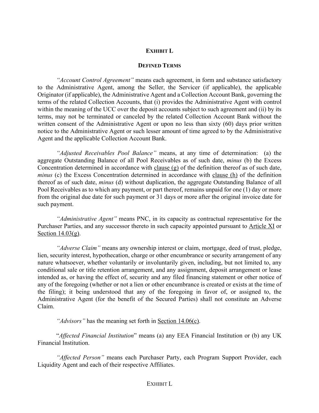 附件L附件L定义条款“账户控制协议”是指卖方、服务商(如适用)、适用的发起人(如适用)、行政代理人和托收账户银行之间就相关托收账户的条款达成的每项形式和实质上均令行政代理人满意的协议,即(i)向行政代理人提供受该协议约束的存款账户的UCC含义内的控制权,以及(ii)根据其条款,未经行政代理人书面同意或至少提前六十(60)天书面通知行政代理人或经行政代理人和适用的收款账户银行同意的较短时间内,不得由相关收款账户银行终止或注销。“调整后的应收账款集合余额”是指,在任何确定时间:(a)截至该日期的所有集合应收账款的未偿余额总额,减去(b)截至该日期根据其定义(g)条确定的超额集中,减去(c)截至该日期根据其定义(h)条确定的超额集中,减去(d)不重复的所有集合应收账款的未偿余额总额,任何付款或其部分,自该等付款的原到期日起一(1)天或更长时间或该等付款的原发票日期后31天或更长时间仍未付款。“行政代理人”是指PNC以买方各方合同代表的身份及其根据XI或第14.03(g)节指定的任何继任者。“反向债权”是指任何所有权权益或债权、抵押、信托契据、质押、留置权、担保权益、抵押、押记或任何性质的任何其他产权负担或担保安排,无论是否自愿给予,包括但不限于任何有条件的出售或所有权保留安排,以及任何旨在或具有以下效力的转让、存款安排或租赁,担保和任何已备案的融资报表或上述任何一项的其他通知(无论在备案时是否设定或存在留置权或其他产权负担);据了解,上述任何有利于行政代理人或转让给行政代理人(为有担保方的利益)的情形均不构成反向债权。“顾问”具有第14.06(c)节规定的含义。“受影响金融机构”是指(a)任何欧洲经济区金融机构或(b)任何英国金融机构。“受影响者”是指每个采购方、每个程序支持提供商、每个流动性代理和每个各自的关联公司。