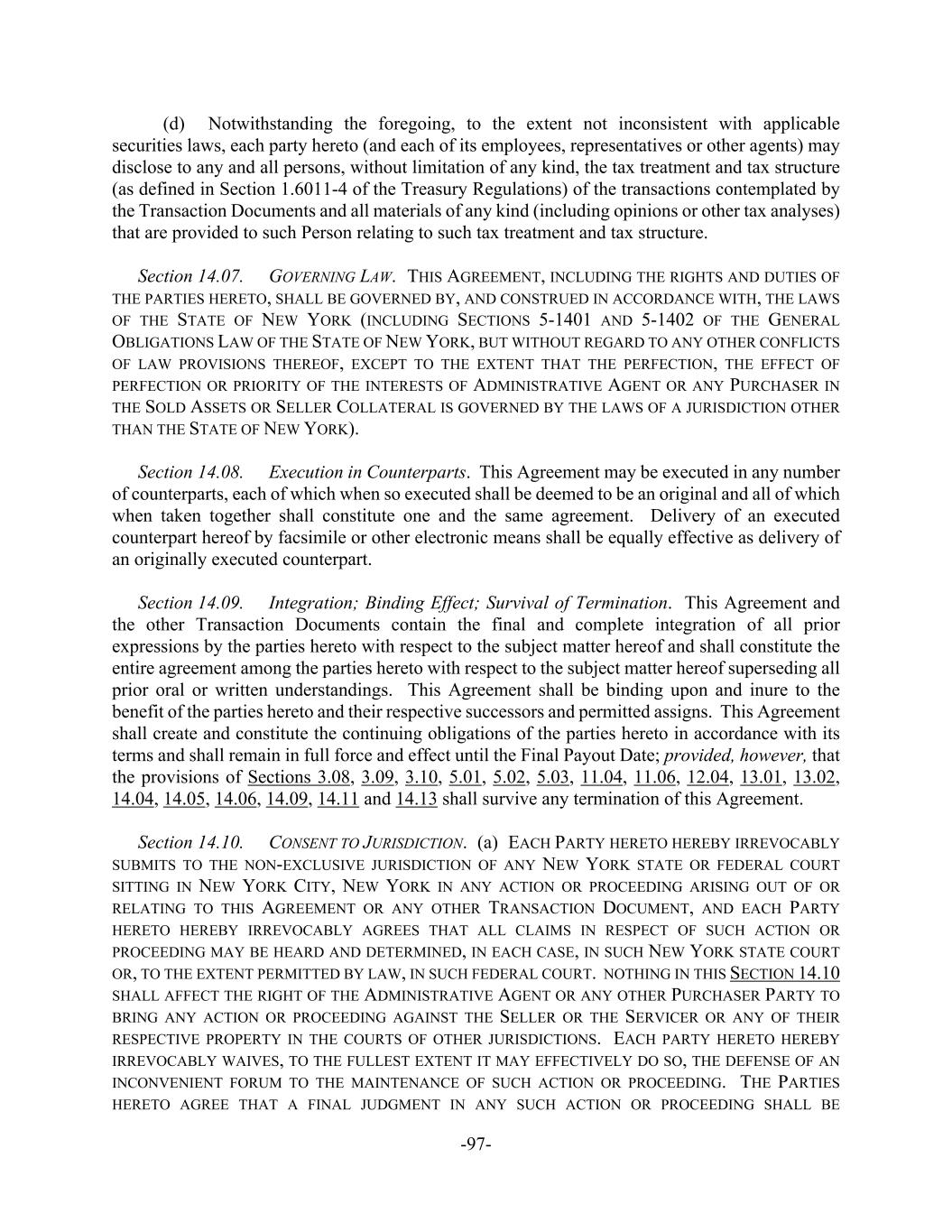 -97-(d)尽管有上述规定,但在不违反适用证券法的范围内,协议各方(及其每一名雇员、代表或其他代理人)可向任何和所有人披露交易文件所设想的交易的税务处理和税务结构(定义见《财政部条例》第1.6011-4节),以及向该人提供的与此种税务处理和税务结构有关的所有种类的材料(包括意见或其他税务分析),但不限于任何种类。第14.07节。治理法。本协议,包括本协议所载各方的权利和义务,应由纽约州法律(包括纽约州《一般义务法》第5-1401和第5-1402条,但不考虑其中任何其他法律规定的冲突,但完美、完美的效果或优先权除外第14.08节。在对口部门执行。本协议可由任意数目的对应方签署,每一方经如此签署后应视为正本,所有这些合并后应构成一份相同的协议。以传真或其他电子方式交付本合同已执行对应方,与交付原已执行对应方具有同等效力。第14.09节。整合;绑定效应;终止的生存。本协议及其他交易文件包含本协议各方就本协议标的事项的所有先前表述的最终完整整合,并应构成本协议各方就本协议标的事项取代所有先前口头或书面谅解的全部协议。本协议对双方及其各自的继承人和许可受让人具有约束力,并符合其利益。本协议应根据其条款产生并构成本协议各方的持续义务,并应在最终支付日期之前保持完全有效;但前提是第3.08、3.09、3.10、5.01、5.02、5.03、11.04、11.06、12.04、13.01、13.02、14.04、14.05、14.06、14.09、14.11和14.13节的规定应在本协议的任何终止后仍然有效。第14.10节。同意管辖权。(a)在因本协议或任何其他交易文件而产生或与之有关的任何诉讼或程序中,此处每一方均不可撤销地向设在纽约市、纽约的任何纽约州或联邦法院的非排他性管辖权提交,并且此处每一方均不可撤销地同意,在每一CC中,可听取和确定与该诉讼或程序有关的所有索赔本第14.10条的任何规定均不影响行政代理人或任何其他买方在其他法域的法院对出卖人或服务人员或其各自的任何财产提起任何诉讼或诉讼的权利。此处的每一方在此不可撤销地放弃,在其可能有效这样做的最大限度内,放弃维持这种行动或程序的不方便的论坛的辩护。此处的各方同意,任何此类行动或程序的最终判决应为