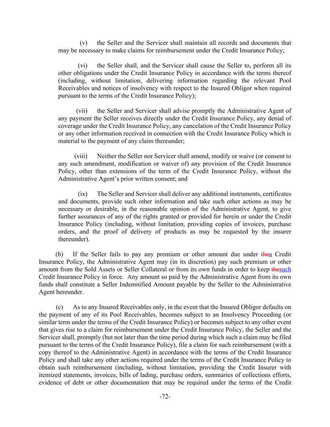 -72-(v)卖方和服务商应保存根据信用保险单提出报销索赔可能需要的所有记录和文件;(vi)卖方应且服务商应促使卖方按照信用保险单的条款履行其在信用保险单下的所有其他义务(包括但不限于,根据信用保险单的条款在需要时交付有关受保义务人的相关集合应收款和破产通知的信息);(vii)卖方和服务商应将卖方根据信用保险单直接收到的任何付款、信用保险单下的任何拒绝承保、信用保险单的任何取消或收到的与信用保险单有关的任何其他对根据其支付任何索赔具有重要意义的信息及时告知行政代理人;(viii)卖方和服务商均不得修改,未经行政代理人事先书面同意,修改或放弃(或同意任何该等修改、修改或放弃)信用保险单的任何条文,但延长信用保险单的期限除外;及(ix)卖方及服务人须交付行政代理人合理认为可能需要或可取的任何额外文书、证明及文件、提供其他资料及采取其他行动,以就本协议或根据信用保险单所授予或规定的任何权利(包括但不限于,提供发票、定购单的副本,以及保险人可能要求的产品交付证明)。(b)如果卖方未能支付根据信用保险单到期的任何保费或其他金额,行政代理人可(酌情)从出售的资产或卖方抵押品或自有资金中支付该保费或其他金额,以保持该信用保险单有效。行政代理人以自有资金支付的任何款项,构成卖方根据本协议应向行政代理人支付的卖方赔偿金额。(c)仅就任何受保应收款而言,如果受保义务人拖欠其任何集合应收款的付款,成为破产程序(或信用保险单条款下的类似条款)的约束,或成为引起根据信用保险单要求偿付的索赔的任何其他事件的约束,卖方和服务商应迅速(但不迟于根据信用保险单条款可提出此种索赔的期间),根据信用保险单的条款就此类补偿提出索赔(并向行政代理人提供一份副本),并应采取信用保险单条款规定的任何其他行动以获得此类补偿(包括但不限于向信用保险人提供逐项报表、发票、提单、定购单、收款工作摘要、债务证据或信用条款可能要求的其他文件