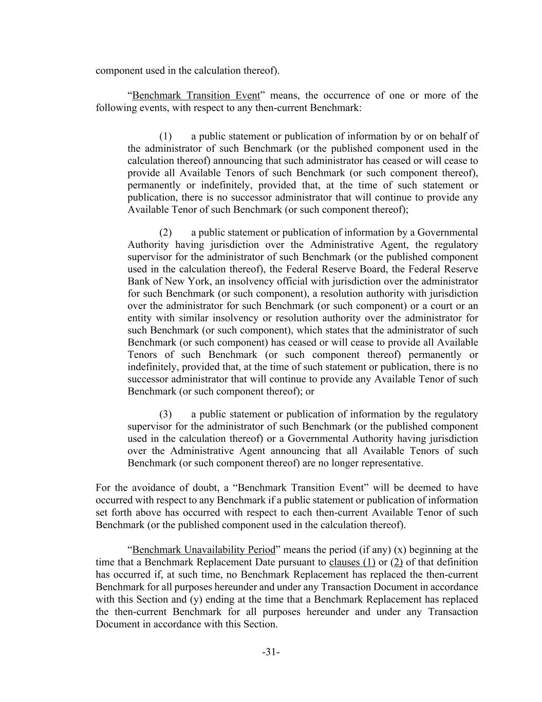 -31-计算中使用的组件)。“基准过渡事件”是指,就任何当时的基准而言,发生以下一项或多项事件:(1)由该基准的管理人或代表该管理人(或其计算中使用的已公布组成部分)宣布该管理人已永久或无限期停止或将停止提供该基准(或其此类组成部分)的所有可用期限的公开声明或发布信息,但前提是,在该声明或发布时,没有继任管理人将继续提供此类基准(或其此类组成部分)的任何可用期限;(2)对行政代理人具有管辖权的政府当局、此类基准(或计算时使用的已公布组成部分)管理人的监管主管、联邦储备委员会、纽约联邦储备银行、对此类基准(或此类组成部分)的管理人具有管辖权的破产官员的公开声明或信息公布,对这类基准(或这类组成部分)的管理人具有管辖权的解决机构或对这类基准(或这类组成部分)的管理人具有类似破产或解决权限的法院或实体,其中规定,这类基准(或这类组成部分)的管理人已停止或将停止永久或无限期地提供这类基准(或其这类组成部分)的所有可用期限,但条件是,在这类声明或公布时,没有继任管理人将继续提供此类基准(或其此类组成部分)的任何可用期限;或(3)监管主管为此类基准(或其计算中使用的已发布组成部分)的管理人或对行政代理人具有管辖权的政府当局发表公开声明或公布信息,宣布此类基准(或其此类组成部分)的所有可用期限不再具有代表性。为免生疑问,如果就该基准的每个当时可用期限(或计算该期限时使用的已公布部分)发生了上述公开声明或信息的公布,则将被视为就任何基准发生了“基准过渡事件”。“基准不可用期间”是指自根据该定义第(1)或(2)条的基准替换日期发生时开始的期间(如有)(x),如果此时没有基准替换已根据本节为本协议项下和任何交易文件项下的所有目的替换当时的基准,并且(y)在基准替换已根据本节为本协议项下和任何交易文件项下的所有目的替换当时的基准时结束。
