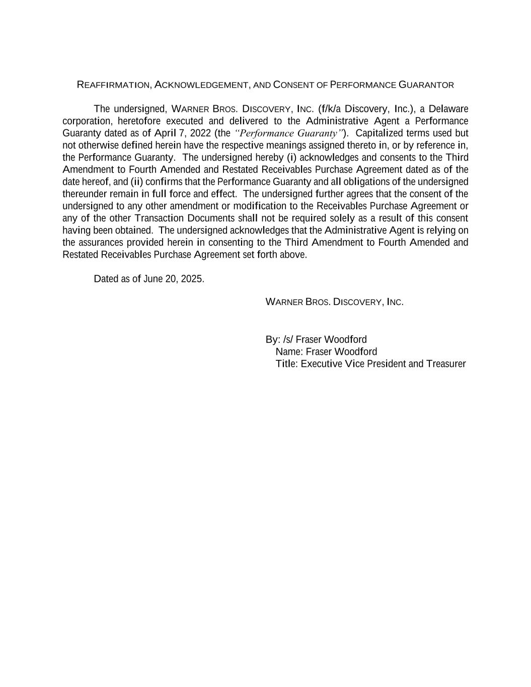 重申、承认和同意业绩保证人以下签署人,WARNER BROS。特拉华州公司Discovery,INC.(f/k/a Discovery,Inc.)此前签署并向行政代理人交付了日期为2022年4月7日的履约保函(“履约保函”)。此处使用但未另行定义的大写术语具有履约保证中或通过引用赋予其的相应含义。以下签署人特此(i)确认并同意截至本协议日期的第四次经修订和重述的应收账款购买协议的第三次修订,及(ii)确认履约保证及以下签署人根据本协议承担的所有义务仍然完全有效。下列签署人进一步同意,以下签署人对应收款购买协议或任何其他交易文件的任何其他修订或修改的同意不应仅因已获得此同意而被要求。以下签署人承认,行政代理人依赖于在同意上述第四次经修订和重述的应收账款购买协议的第三次修订中提供的保证。截至2025年6月20日。华纳兄弟。DISCOVERY,INC。作者:/s/Fraser Woodford姓名:Fraser Woodford职务:执行副总裁兼财务主管