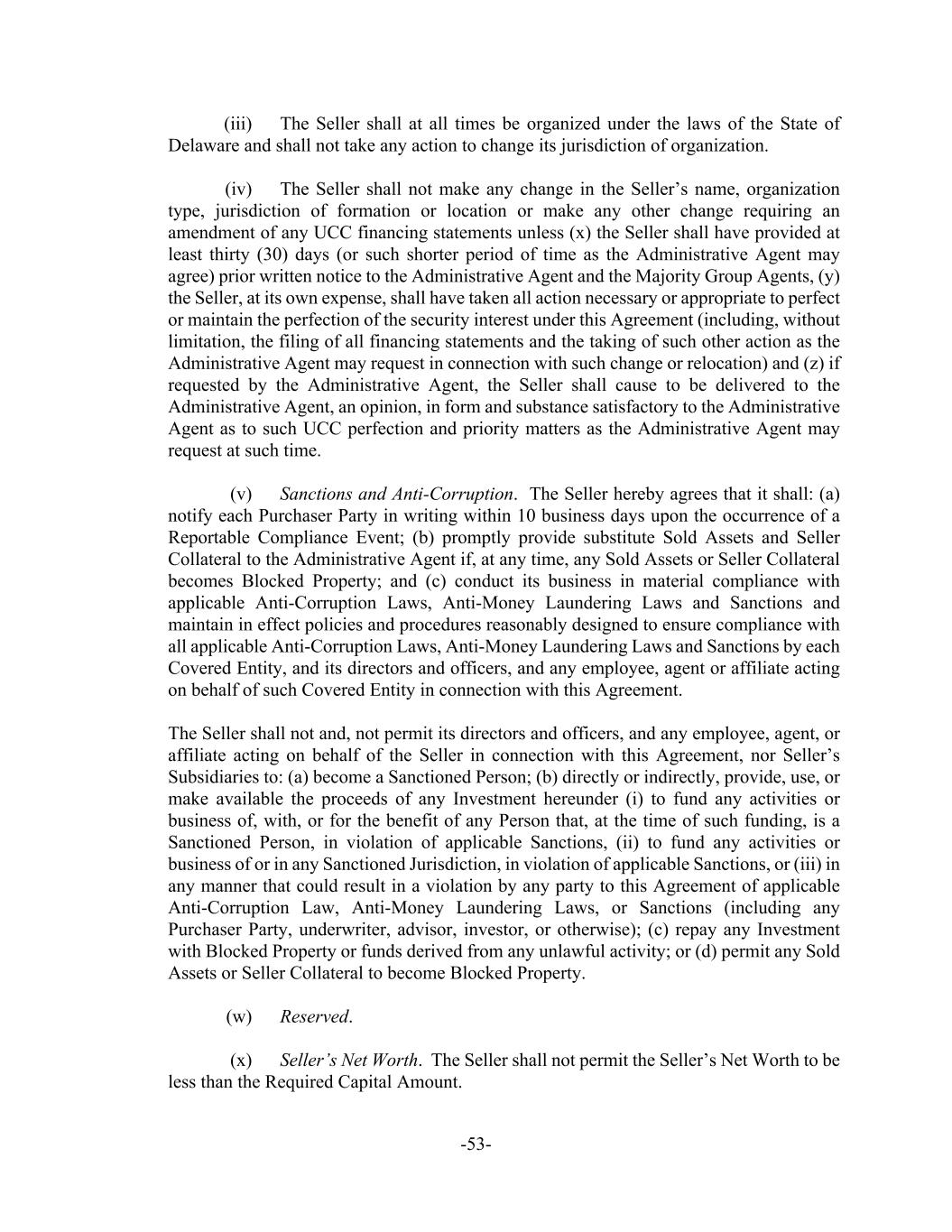 -53-(iii)卖方在任何时候都应根据特拉华州的法律进行组织,不得采取任何行动改变其组织管辖权。(iv)卖方不得对卖方的名称、组织类型、成立管辖权或所在地进行任何变更,或进行任何其他需要修改任何UCC融资报表的变更,除非(x)卖方已向行政代理人和多数群体代理人提供至少三十(30)天(或行政代理人可能同意的较短时间)的事先书面通知,(y)卖方自费已采取一切必要或适当的行动以完善或维持本协议项下担保权益的完善(包括,但不限于所有融资报表的备案以及采取行政代理人可能要求的与该等变更或搬迁有关的其他行动)和(z)如行政代理人提出要求,卖方应安排向行政代理人交付一份形式和实质上令该行政代理人满意的意见,内容是该行政代理人当时可能要求的UCC完善程度和优先权事项。(五)制裁和反腐败。卖方在此同意:(a)在发生可报告的合规事件后10个工作日内书面通知每一买方;(b)在任何时候,任何已售资产或卖方抵押品成为被封锁财产时,迅速向行政代理人提供替代的已售资产和卖方抵押品;(c)在实质上遵守适用的反腐败法、反洗钱法和制裁的情况下开展业务,并保持有效的政策和程序,这些政策和程序是合理设计的,以确保每个涵盖实体遵守所有适用的反腐败法、反洗钱法和制裁,及其董事和高级职员,以及代表该涵盖实体就本协议行事的任何雇员、代理人或关联公司。卖方不得、也不允许其董事和高级职员、代表卖方就本协议行事的任何雇员、代理人或关联公司,也不允许卖方的子公司:(a)成为受制裁人员;(b)直接或间接提供、使用或提供本协议项下任何投资的收益(i)为任何在提供资金时为受制裁人员的人的任何活动或业务提供资金,或为其利益提供资金,违反适用的制裁,(ii)为任何受制裁司法管辖区或在任何受制裁司法管辖区的任何活动或业务提供资金,违反适用的制裁,或(iii)以任何可能导致本协议任何一方违反适用的反腐败法、反洗钱法或制裁(包括任何买方方、承销商、顾问、投资者或其他方面)的方式;(c)以被封锁的财产或任何非法活动所得的资金偿还任何投资;或(d)允许任何出售的资产或卖方抵押品成为被封锁的财产。(w)保留。(x)卖方净值。卖方不得允许卖方的净资产低于规定的资本金额。